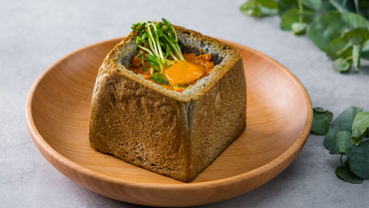 『コカトリスの石焼き親子あんかけ』は、危険な魔物「コカトリス」の肉や魔物植物を食材にした料理。お皿に使われたレンガも魔物生物で、そのお皿ごと食べることができるというユニークなもの。料理の再現ポイントはこのお皿。竹炭でグレーに色をつけた特製食パンを開発し1斤丸ごと使用。そこに⼤⻨ご飯とほうれん草を詰め、鶏ひき⾁・かぼちゃ・にんじん・完熟トマトソースなどで作ったフィリングをのせ、⾖苗を添え卵を落としたら…、オーブンで焼き上げて再現完成。世界観を存分にご堪能いただけるメニューです。