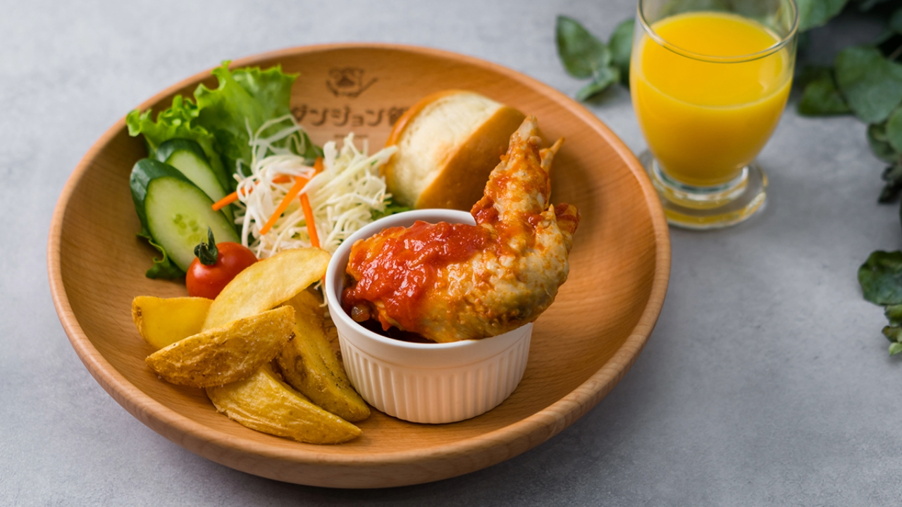 『レッツ炎⻯にカツレツ』は、⼀度空腹でレッドドラゴンに負けたライオスたちが、同じ轍は踏まないと、これからの⼤仕事に備えて腹ごしらえする場⾯の料理。その食材は、グロテスクな見た目の大ガエルの肉。再現食材は、⾷べ応えと満⾜感を重視して150gのボリュームある鶏肉を選定。赤ワインでつくられたソースもポイントで、作中の調理工程そのままに玉ねぎを赤ワインで煮詰めてソースを作っています。スープとサラダ、パンもセットで冒険者のお腹を満たすメニューです。