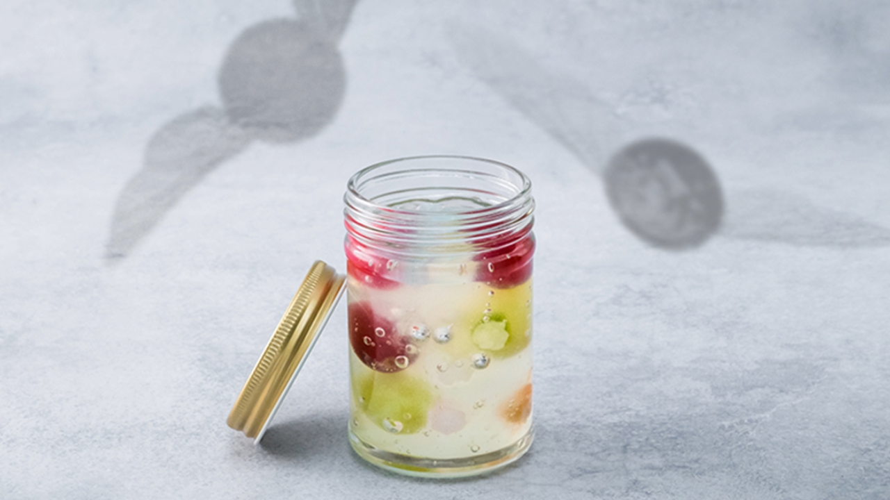 ⾊鮮やかな琥珀糖とフルーツ、きらきら輝くアラザン⼊り。