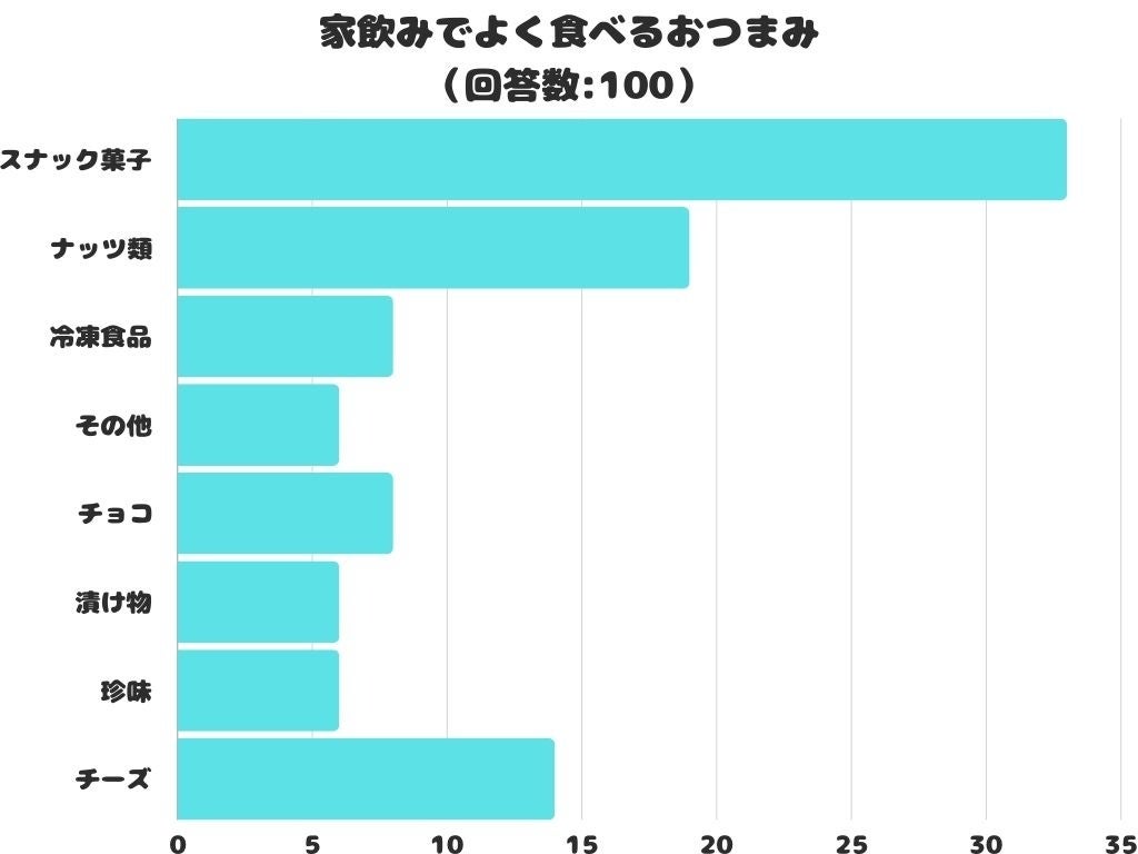 家飲みでよく食べるおつまみをアンケートにて調査したところ、1位は「スナック菓子」でした。