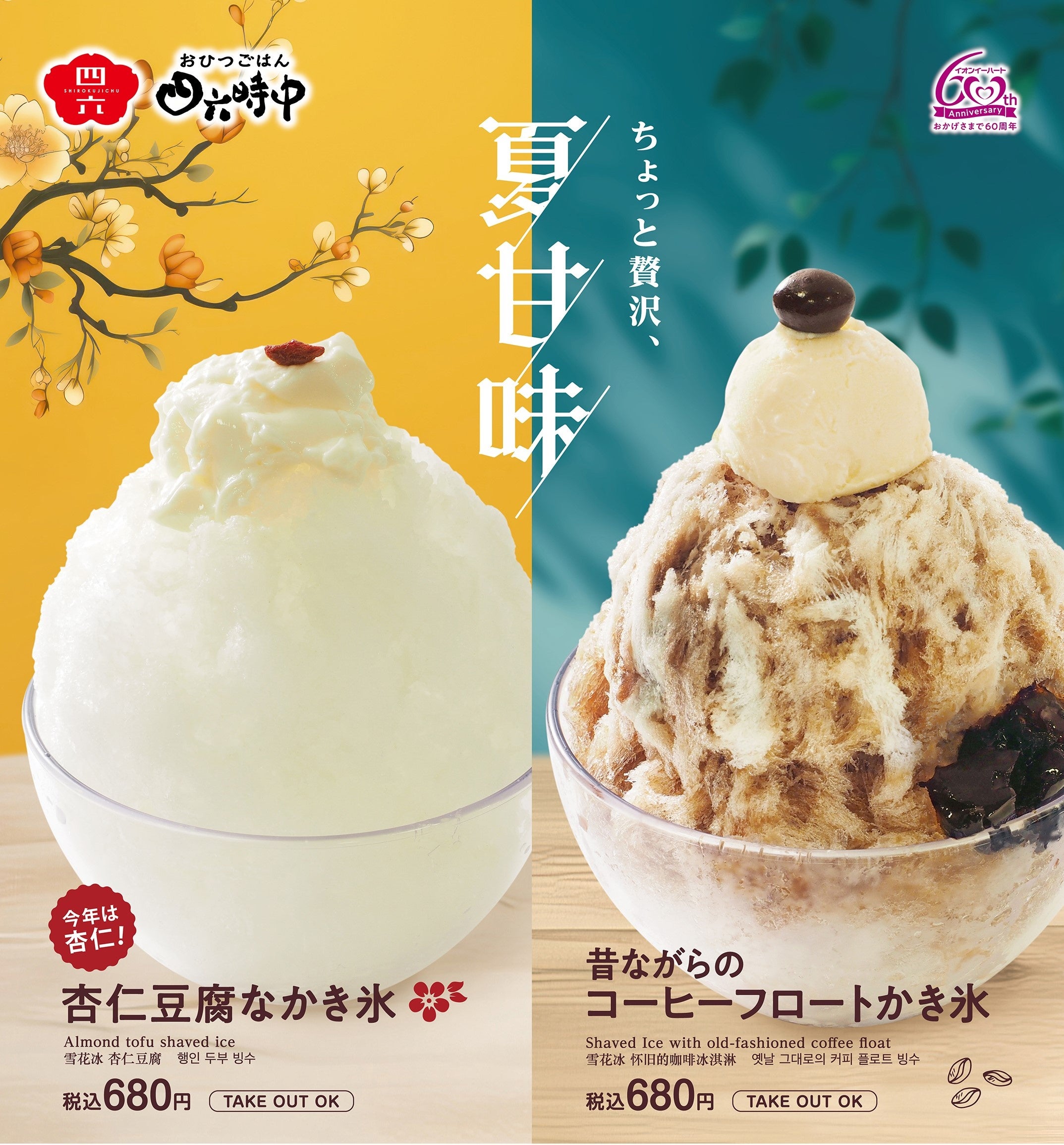 当社は、ちょっと贅沢な夏甘味をテーマに『おひつごはん四六時中』にて、新たに2種類のかき氷を販売いたします。特に注目商品「杏仁豆腐なかき氷」は、ほんのり甘いアーモンドのような風味の杏仁シロップに、プルプルとした食感の杏仁豆腐をトッピングし、真っ白なかき氷にクコの実を添えました。まるで本物の杏仁豆腐を食べているかのような体験ができる商品です。もう一つの「昔ながらのコーヒーフロートかき氷」は、コーヒーシロップやコーヒーゼリー、バニラアイスをトッピングした、香り豊かな大人の味わいが楽しめます。この夏、異なるフレーバーの2種類のかき氷で、贅沢なひとときをお楽しみいただけます。