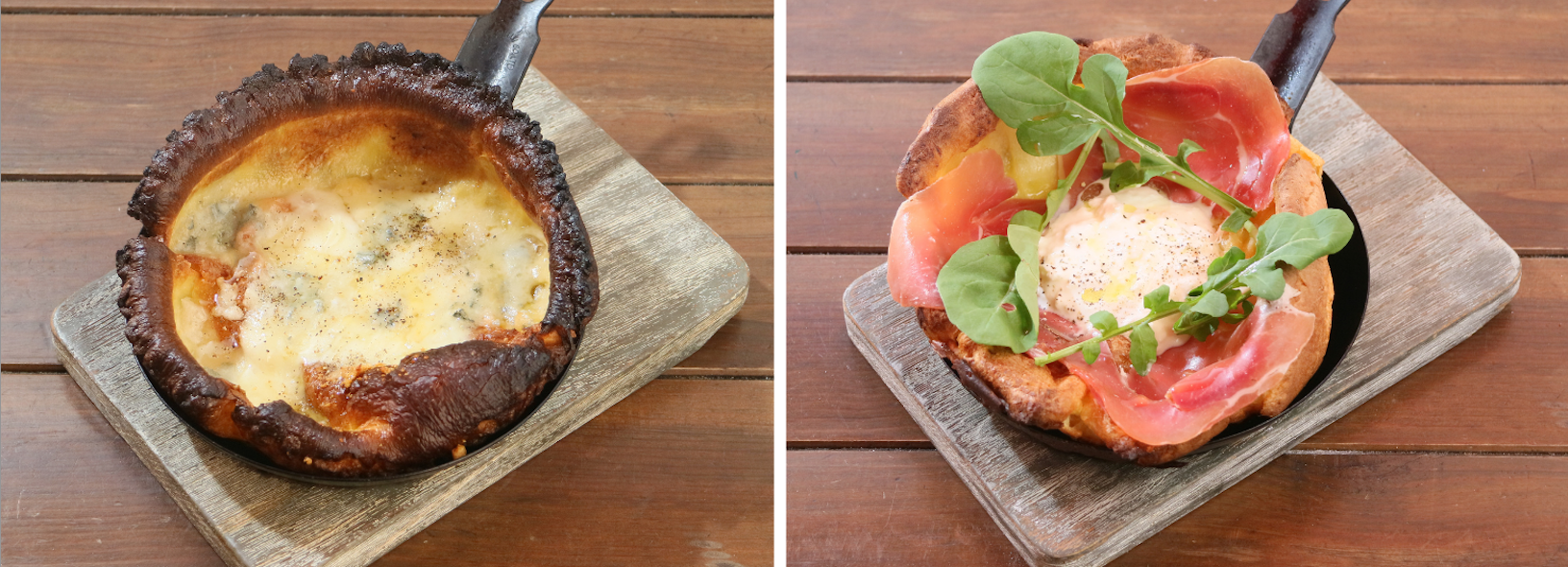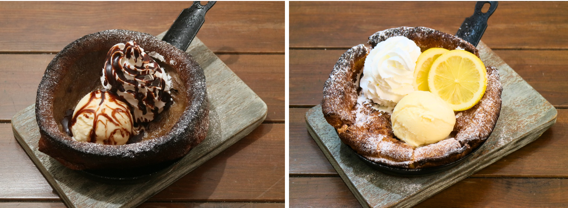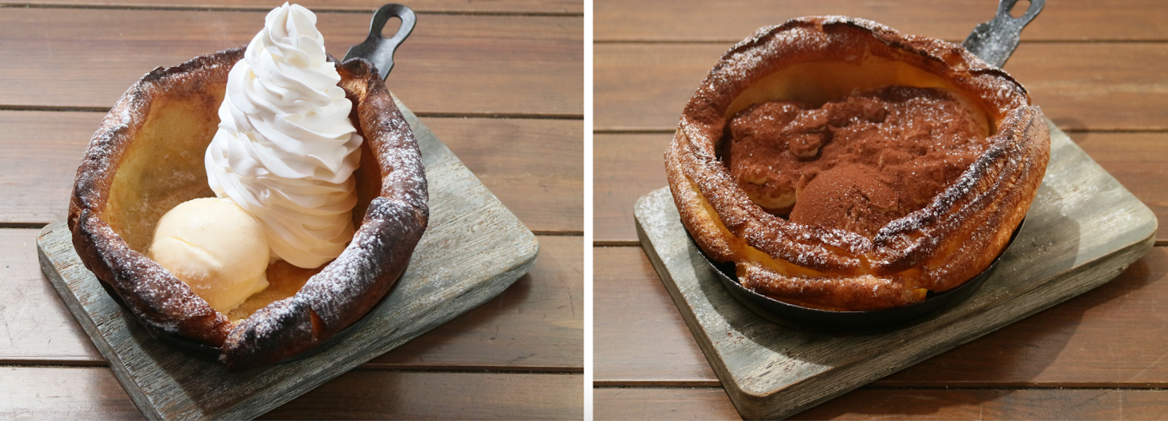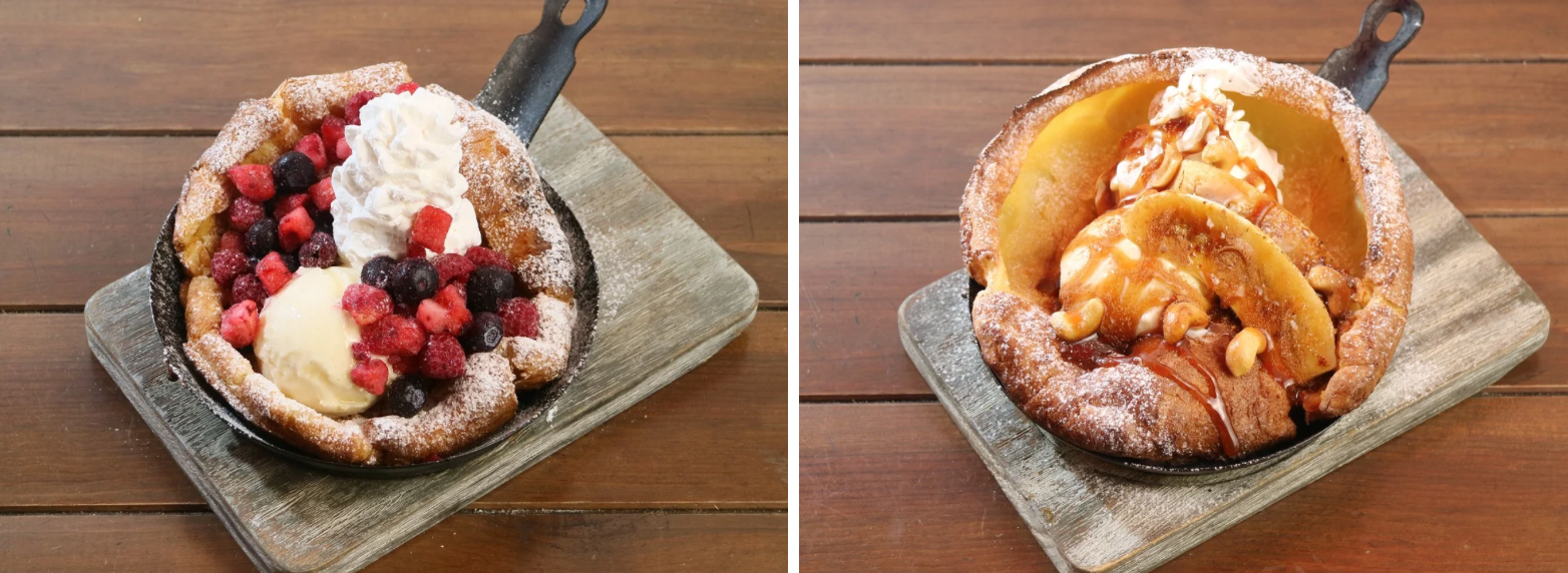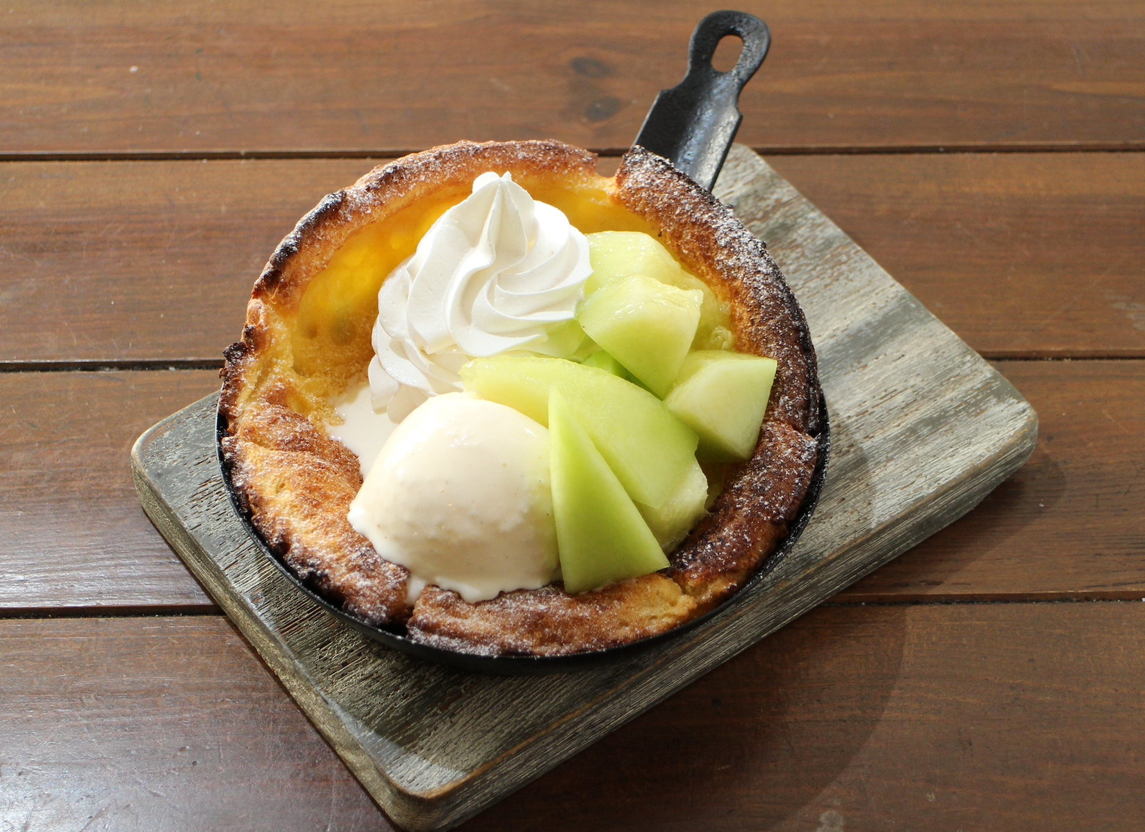 甘みが強く、ジューシーな味わいが特徴で、食べれば口の中でとろけるような食感が楽しめます。メロンの爽やかな甘さと、外はカリッと中はもっちりとした「ダッチベイビーパンケーキ」との相性は抜群です。さらに、上にはジェラートバニラとホイップクリームが添えられ、パンケーキとのハーモニーを引き立てます。ジェラートバニラのまろやかな味わいと、ホイップクリームのふわふわ感が、メロンとパンケーキのフレッシュな組み合わせをさらに豊かに演出します。一口ごとに至福のひとときをお届けします。