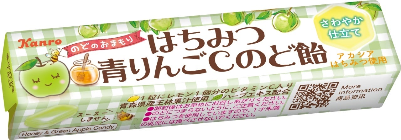 今回発売する「はちみつ青りんごCのど飴」は、こだわりのアカシアはちみつと青森県産りんご「王林」の果汁を配合し、夏にぴったりな酸味の効いたさわやかな味わいをお楽しみいただけます。果汁の風味が損なわれないように仕上げ、やさしくのどを潤すとともに、おいしくビタミンCも摂取できます。