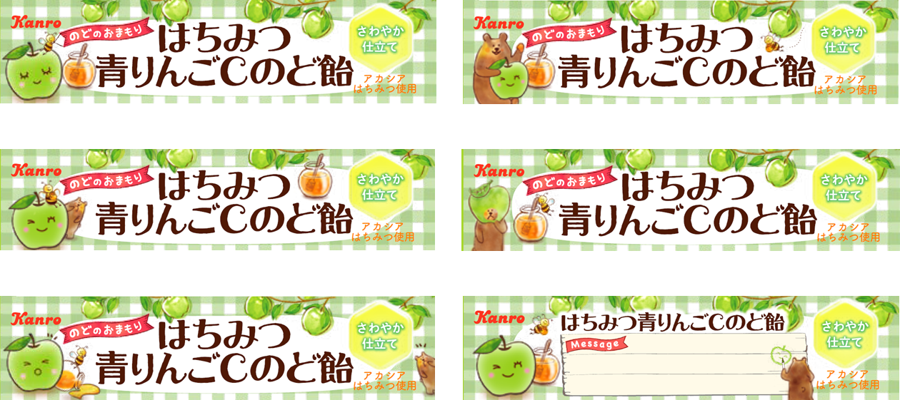 パッケージは、やわらかなタッチで描かれた癒し系のキャラクターをあしらった、シリーズの優しい世界観が感じられる6種類を展開します。背景は定番品の「はちみつレモンCのど飴」の黄色のボーダー柄に対し、「はちみつ青りんごCのど飴」は夏らしいさわやかな黄緑色のギンガムチェック柄を施しています。スティックキャンディ売り場ではこれまでなかなか出会うことのなかった、情緒感あふれるデザインにもぜひご注目ください。