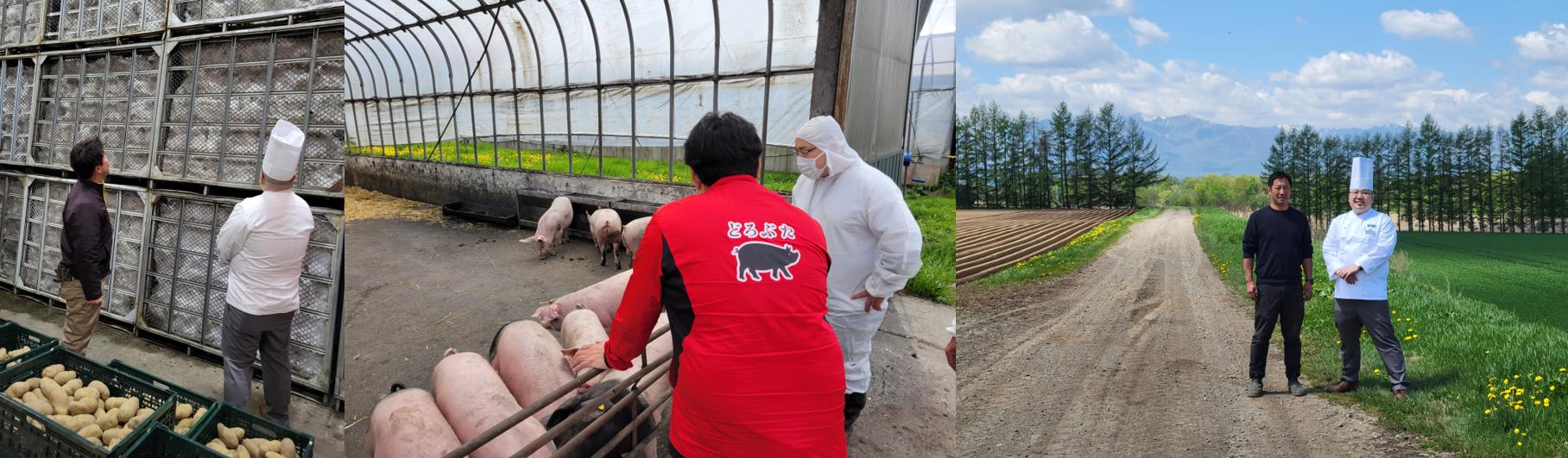 シェフ當間が現地を訪れ、生産者さまと直接触れ合いながら北海道の魅力ある旬の食材を吟味しました。「雪蔵甘熟メークイン二冬越 (ふたふゆごし)」を生産している「とかち井上農場」では大きな雪蔵貯蔵庫を見学。広大な大地でのびのびと育てられたエルパソ豚牧場の放牧豚「どろぶた」や、十勝の美味しい野菜を全国に届けたい、と若手生産者が集まって野菜作りに取り組んでいる「なまら十勝野」の旬の野菜も厳選しました。