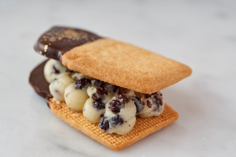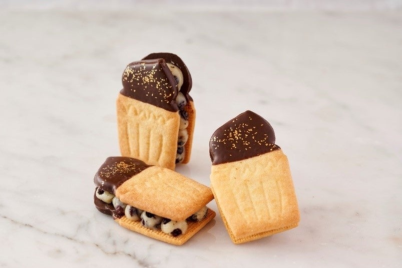 ホイップしたバターに生クリームを加えた贅沢なクリームと、紅茶に漬け込んだ風味豊かなレーズンを、1枚1枚丁寧に焼き上げたビスケットで挟んだ、重厚感たっぷりの贅沢な味わい。