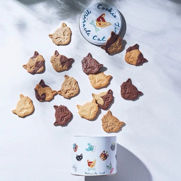 “神様のいたずら”と呼ばれる、珍しい柄や不思議な柄のネコたちが主役の手づくりネコクッキー缶です。