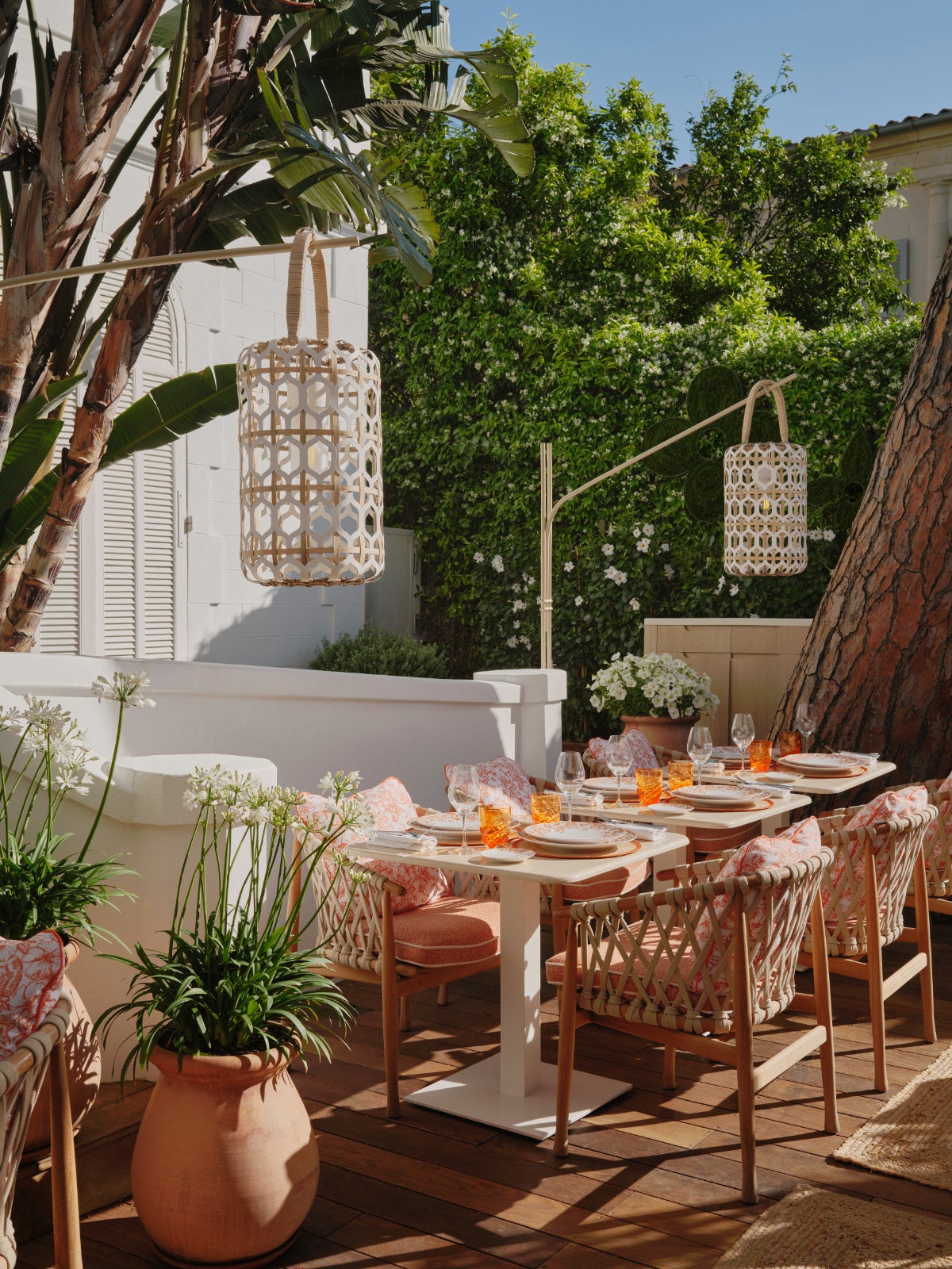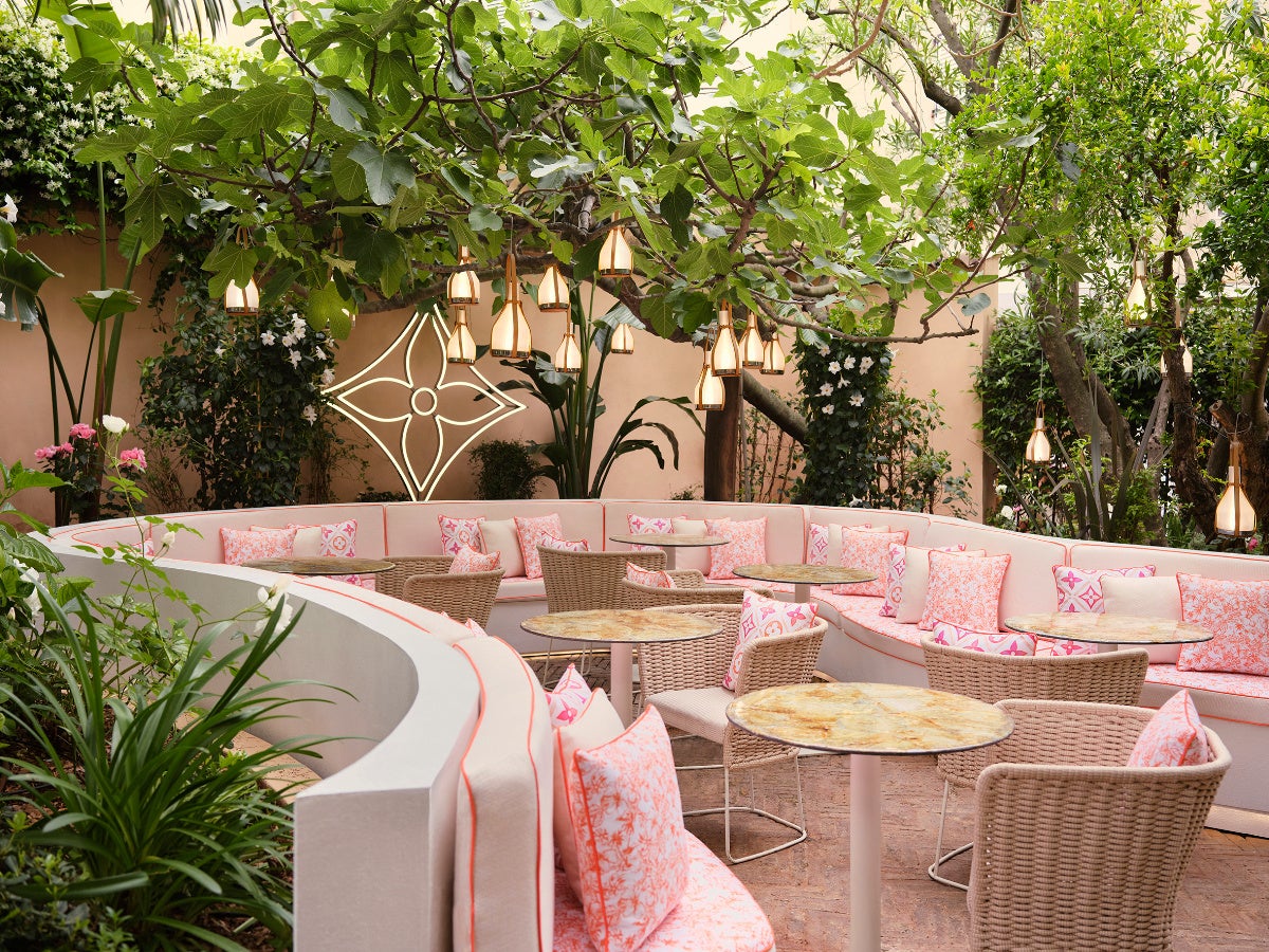 また当然ながらサントロペというロケーションは、このレストランにシックでリラックスした雰囲気をもたらしています。籐の家具は天然素材のマクラメで装飾され、内装には全体的に、「LV バイ·ザ·プール」コレクションのエレガントなオレンジの配色で描かれた 水彩画のようなモノグラム·モチーフが。事実としてこの色は1970-80年代のコートダ ジュール、すなわちフレンチ·リヴィエラの黄金時代への回帰を意味し、当時はオレンジやイエロー、オークルといった色彩が家々のファサードやビーチ、服装、インテリアデザインに多く使われていました。また植栽に囲まれたテラスは、ルイ·ヴィトンのシグネチャーであるフラワー·モチーフで彩られています。