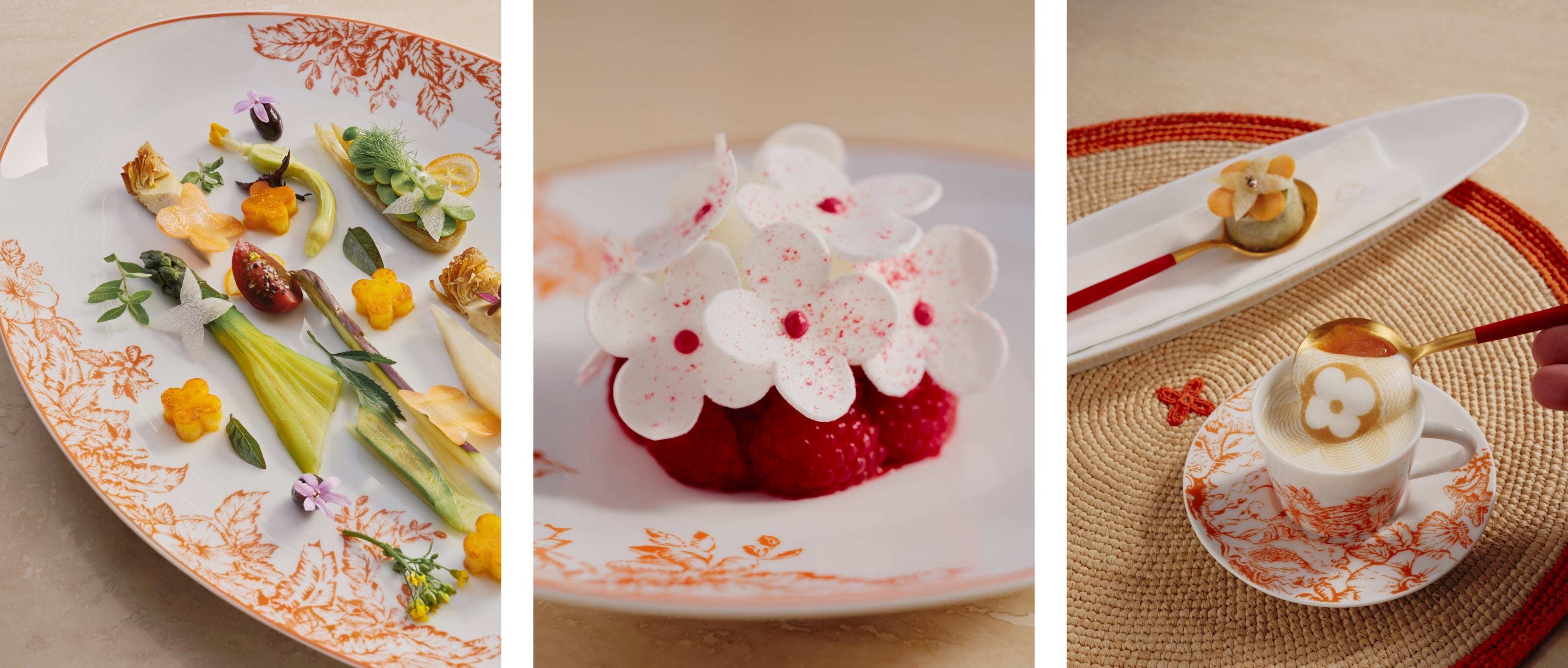 素朴に見えて工夫を凝らしたトマトタルト。ヴェルヴェーヌが香るソルベを添えた天然の海老。オレガノ風味のローストチキン、ハーブたっぷりのガーデンベジタブルとポテトムスリーヌ添え。アルノー·ドンケルは最高級の地産食材をプロヴァンスと地中海地方を巡る感覚の旅へと変化させます。一方、マキシム·フレデリックは、ラズベリーパヴロヴァやヴァシュランアイスクリームケーキなど、昼夜問わず楽しめるクラシックなフランスのデザートをクリエイティブに再解釈。新鮮な食材から細心の注意を払った調理法まで、食のフィロソフィーに裏打ちされた2人のアプローチはすべての料理に活気をもたらし、熟練した技を讃えるルイ·ヴィトンならではの価値観と完璧に調和しています。