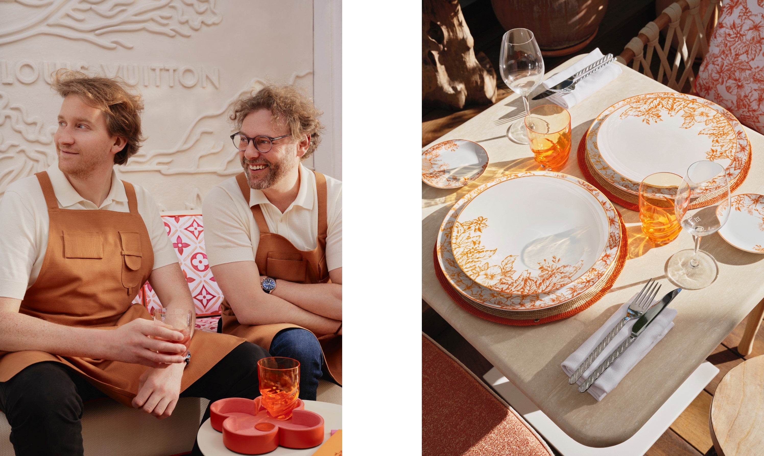 レストランの再来に合わせ、心地よいシックな魅力が息づくサントロペにぴったりな ルイ·ヴィトンのテーブルウェア·コレクションの新作が登場。エクストラホワイトの上質なリモージュ磁器で作られた今シーズンのディナーウェアは、花や珊瑚、ヒトデが溢れる熱帯の楽園を想わせます。メインプレートから多目的ボウル、ティーカップ、ソーサーにいたるまで、これらのモチーフが夏のテーブルセッティングに一段と華やぎを添えます。テーブルウェア·コレクションと揃いのテーブルマットはルイ·ヴィトン ストアにて限定販売され、ディテールまで細心の注意を払いながらラフィア(ヤシ)素材を手作業で編み 上げたもの。クラシカルなラウンドシェイプにオレンジの縁取りがアクセントとなり、センターには同色の繊細なモノグラム·フラワーが刺繍されています。オレンジのLV リゾート テーブルウェア·コレクションと完璧にマッチすることでしょう。