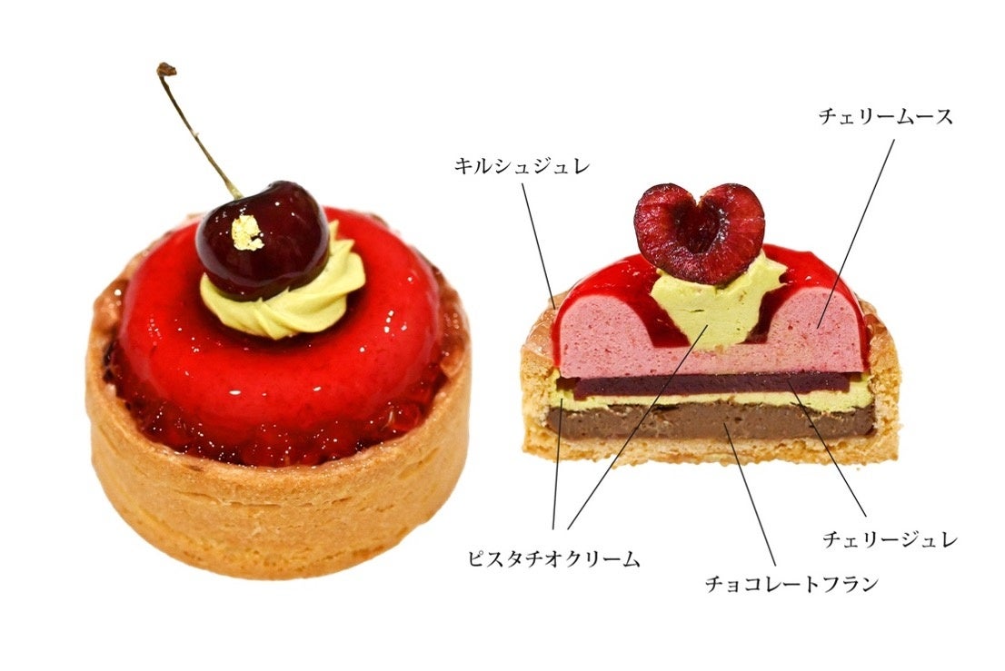 アメリカンチェリーピューレをふんだんに使用した甘酸っぱいムースに、キルシュで風味付けしたジュレとピスタチオクリームを合わせたちょっと大人なクッキーフラン。
