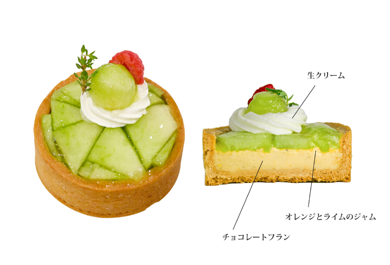 当店こだわりのクッキーフランに、ライム香るオレンジジャムを薄く塗り、その上にたっぷりとメロン果肉を乗せて仕上げています。オレンジジャムが味全体を引き締めていて、メロンの果肉を最後までお楽しみいただける構成です。