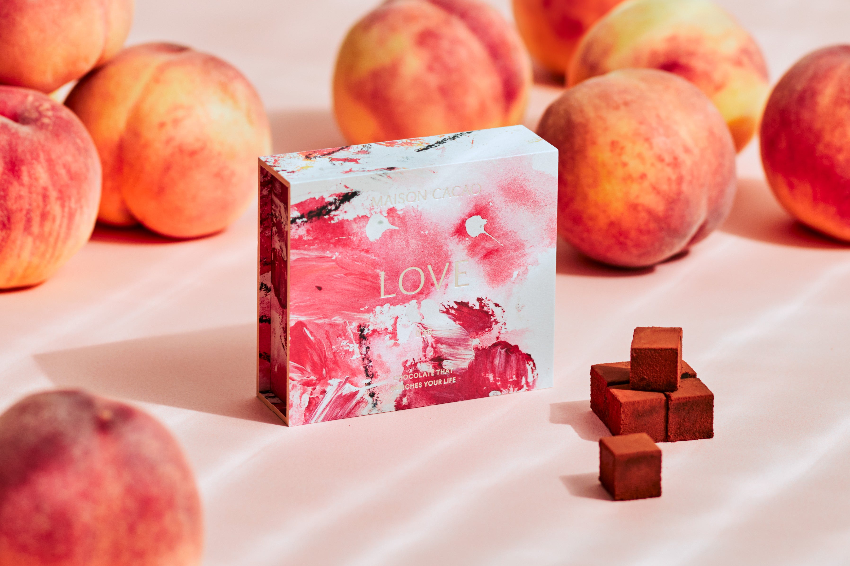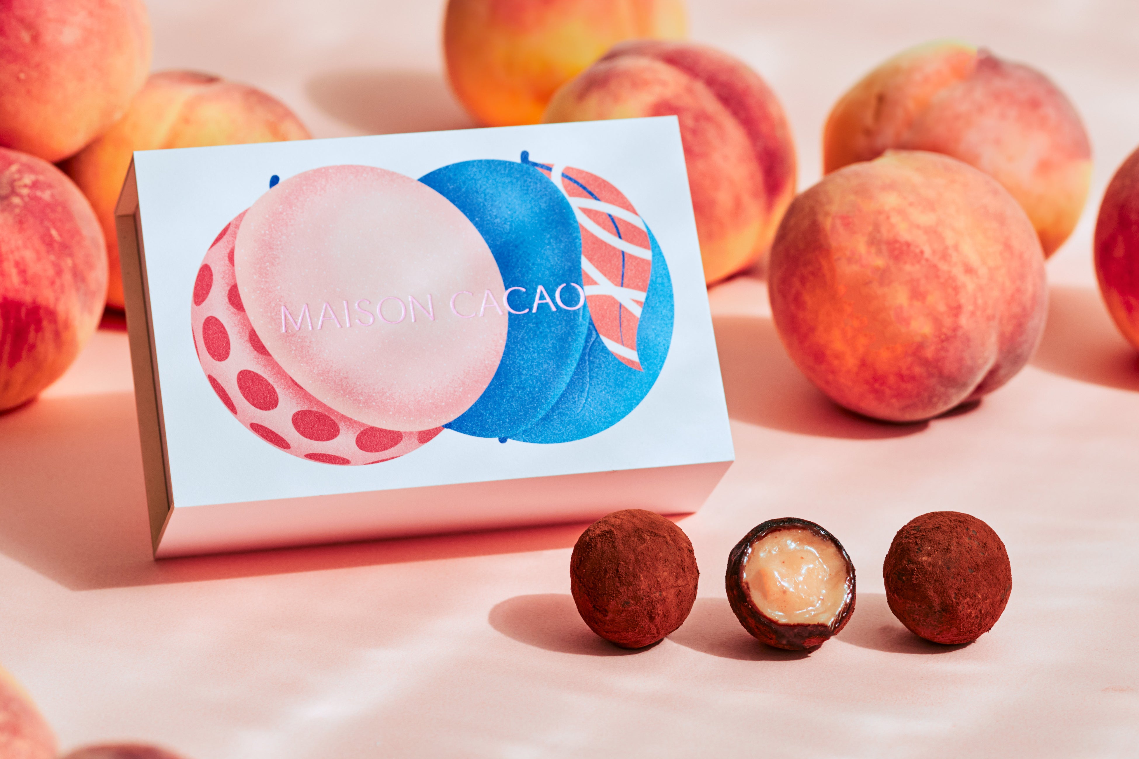 代表の石原が日本各地を旅して出会った生産者の素材へのこだわりを聞き、その美味しさを最大限に引き出すチョコレートを作り、旬の味わいとして提案しています。7-8月は山梨県山梨市、桃の名産地の中でもひときわ手間暇をかけて育てられた笠井農園の4種の白桃が登場。