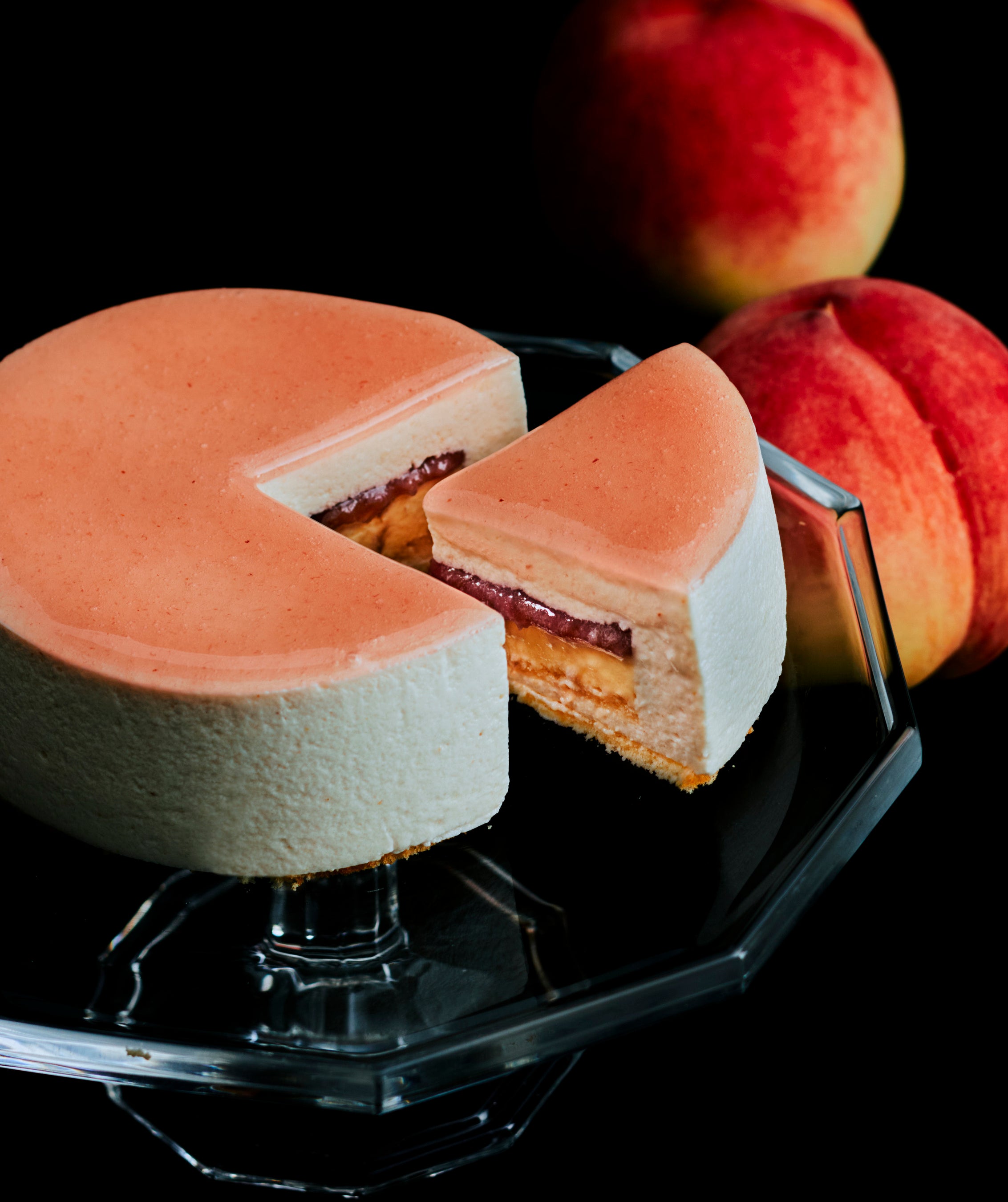 シンプルな美しさにこだわりながらも、味わいと食感を4層で作り込んだ一品です。手焼きのタルト生地に濃厚な”川中島白桃”のピューレを敷き、ホワイトチョコレートとヨーグルトと合わせた滑らかな白桃クリームを流し入れました。最後に表面をコーティングし、香りを閉じ込めています。