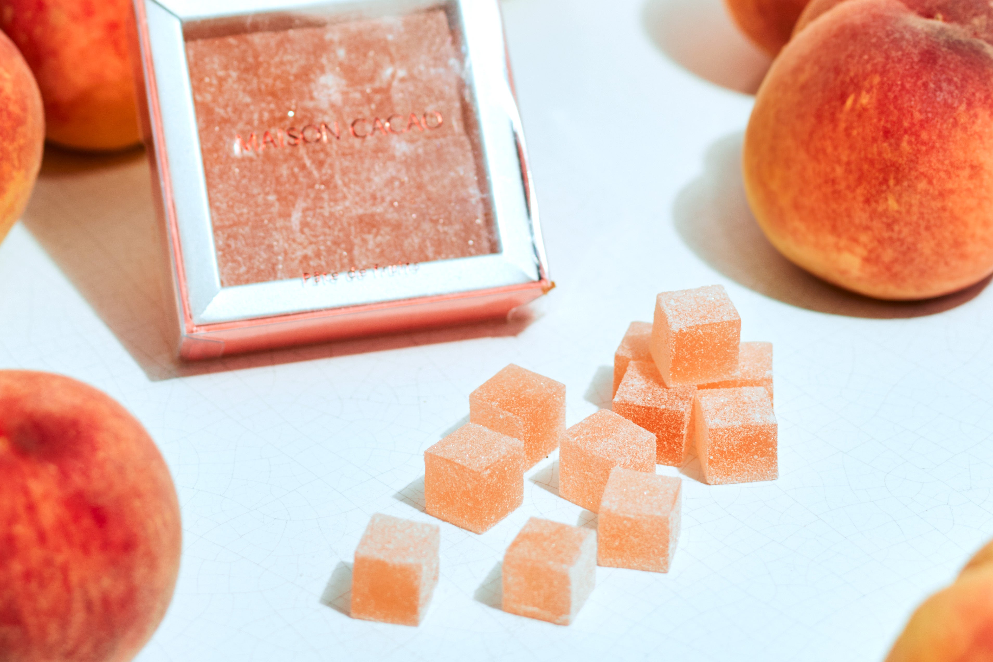 季節ごとの旬の果実の果汁とピューレを閉じ込めた、みずみずしいゼリーのパート・ド・フリュイ。「旅するメゾン」で全国各地の最高品質の素材と出会う、メゾンカカオならではの特別な一品です。