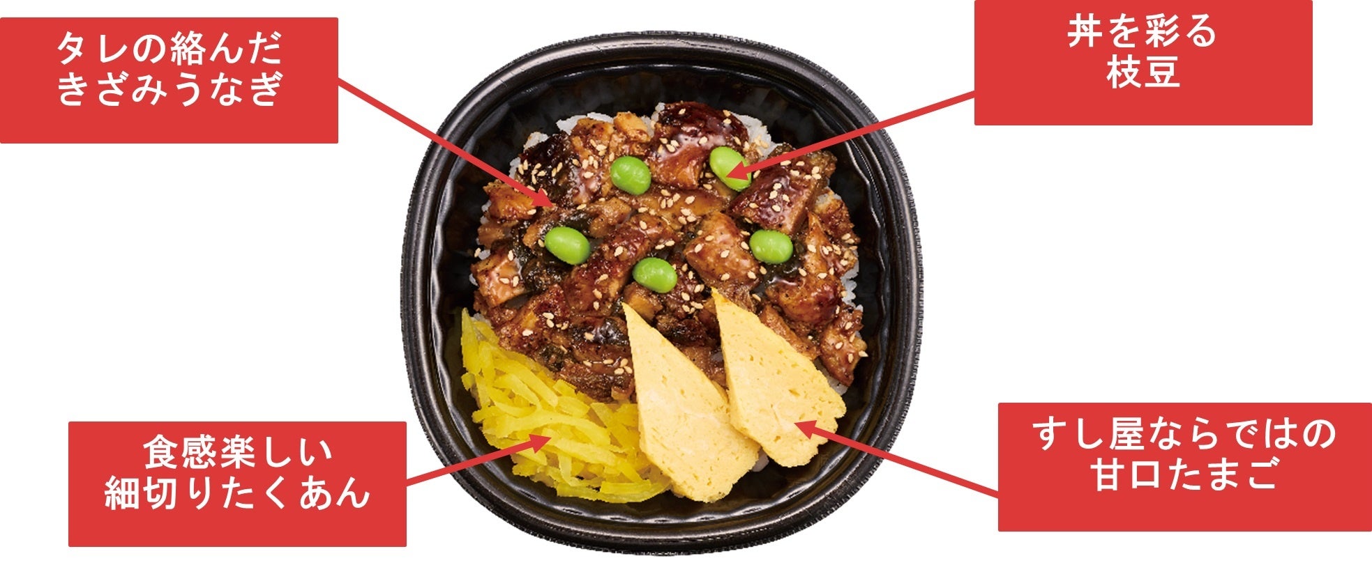 スシローの“うな丼”は、土用の丑の日に合わせて販売している夏の期間限定商品で、毎年多くのお客さまからご好評をいただいております。今年はスシロー初の試みとして、丼の底までずっとうなぎを感じられるように、タレの絡んだきざみうなぎを2重仕立てにした「うなぎまぶし丼」をご用意いたしました。食べやすいサイズのきざみうなぎが一口目から口の中に広がり、トッピングの甘口たまごや細切りたくあん、枝豆と一緒に食べることで豊富な味のバリエーションをお楽しみいただけます。また、大切りのうなぎを贅沢に味わえる「大切りうなぎ3貫」や、人気の定番セットと大切りうなぎを楽しめる「土用丑の日10貫セット(1人前)」もご用意いたします。