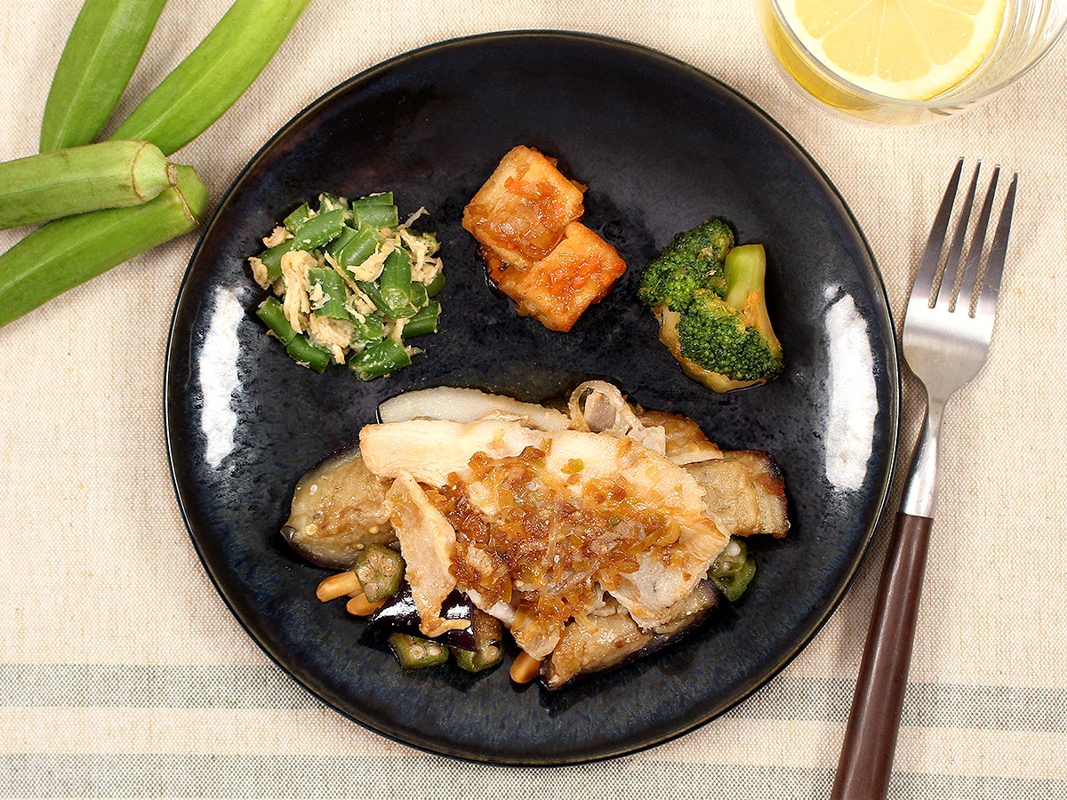 副菜は、いんげんとチキンのごまだれ、絹揚げの甘酢、パンチのあるブロッコリーのシビ辛あえです。