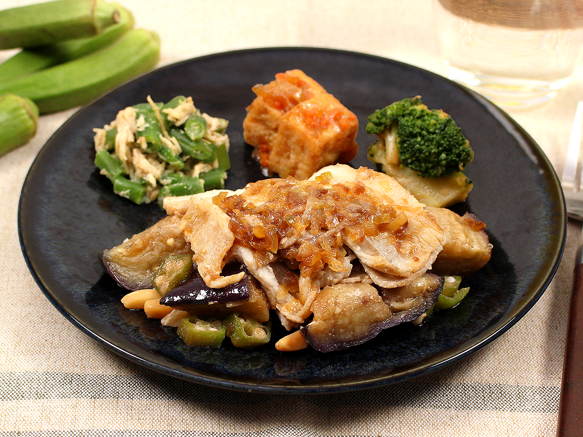 副菜は、いんげんとチキンのごまだれ、絹揚げの甘酢、パンチのあるブロッコリーのシビ辛あえです。