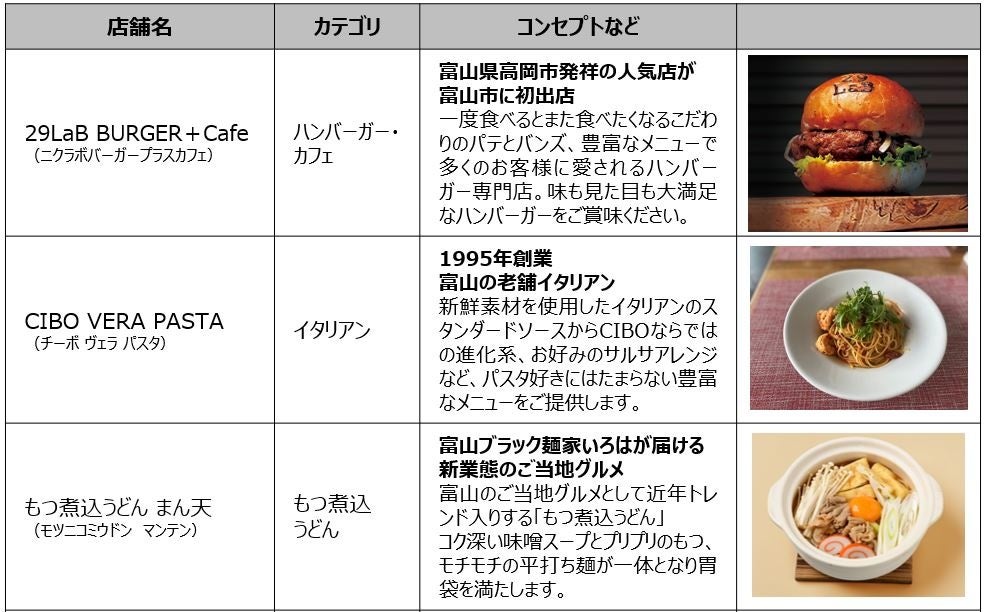 本事業は、商業施設の飲食エリアにおいてぐるなびがコンセプト設計から店舗構築、フロア運営まで総合的にプロデュースする事業で、商業施設のニーズに合わせて複数の出店形式でサービスを提供します。「GURUNAVI FOODHALL WYE」の名称で全国展開を進めており、今回のオープンが7店舗目で北陸に初進出。地元富山の名店から富山初出店の人気店まで、ぐるなびならではのネットワークを活かしたバラエティ豊かなテナントが出店します。