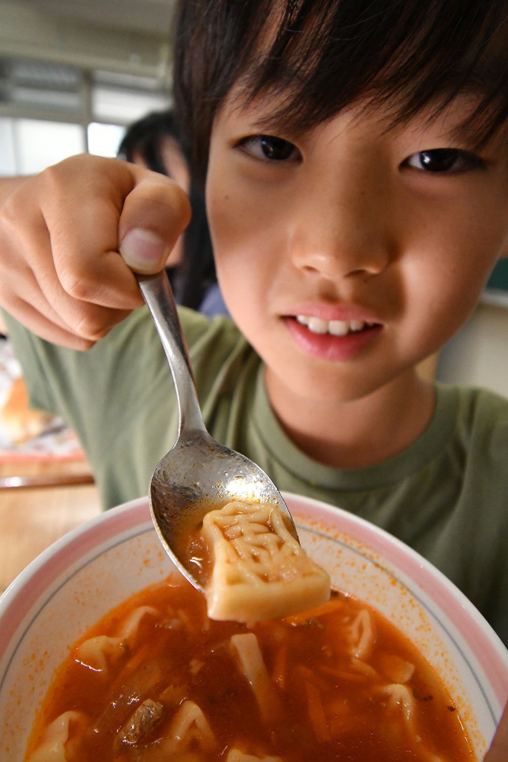 令和6年6月25日(火曜日)、今秋の新関西将棋会館開館を控え、ますます盛り上がりを見せる「将棋のまち高槻」の市立小中学校給食に、市オリジナルメニューの将棋駒をかたどったパスタ入りミネストローネが初めて登場し、子どもたちはスプーンですくったパスタを笑顔で眺めるなど楽しい給食の時間を過ごしました。