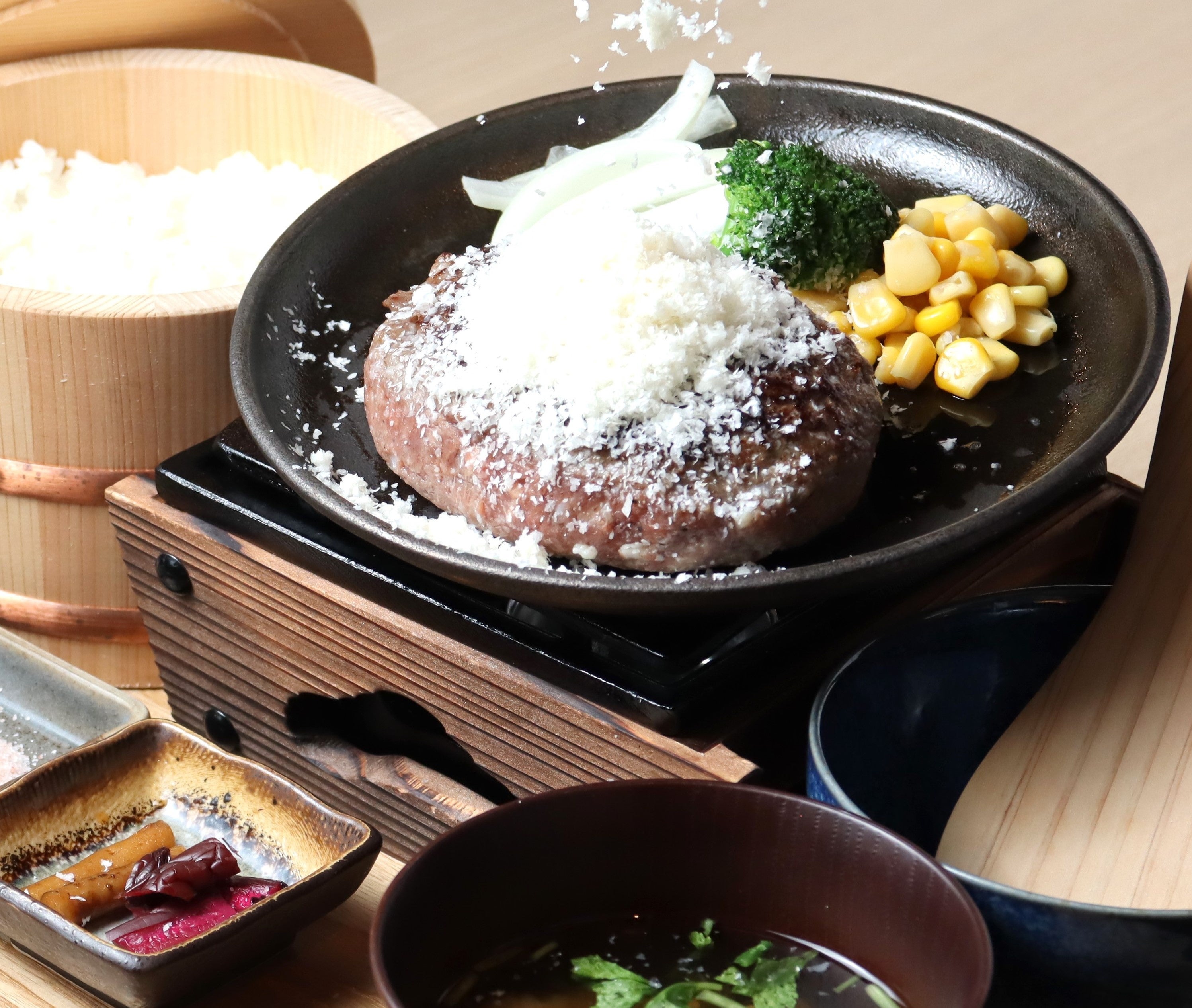 国産牛・和牛を使用したとろけるハンバーグは、一口ずつ切り分け鉄板で焼きながらお召し上がりいただく、鉄板焼きスタイルのハンバーグ。