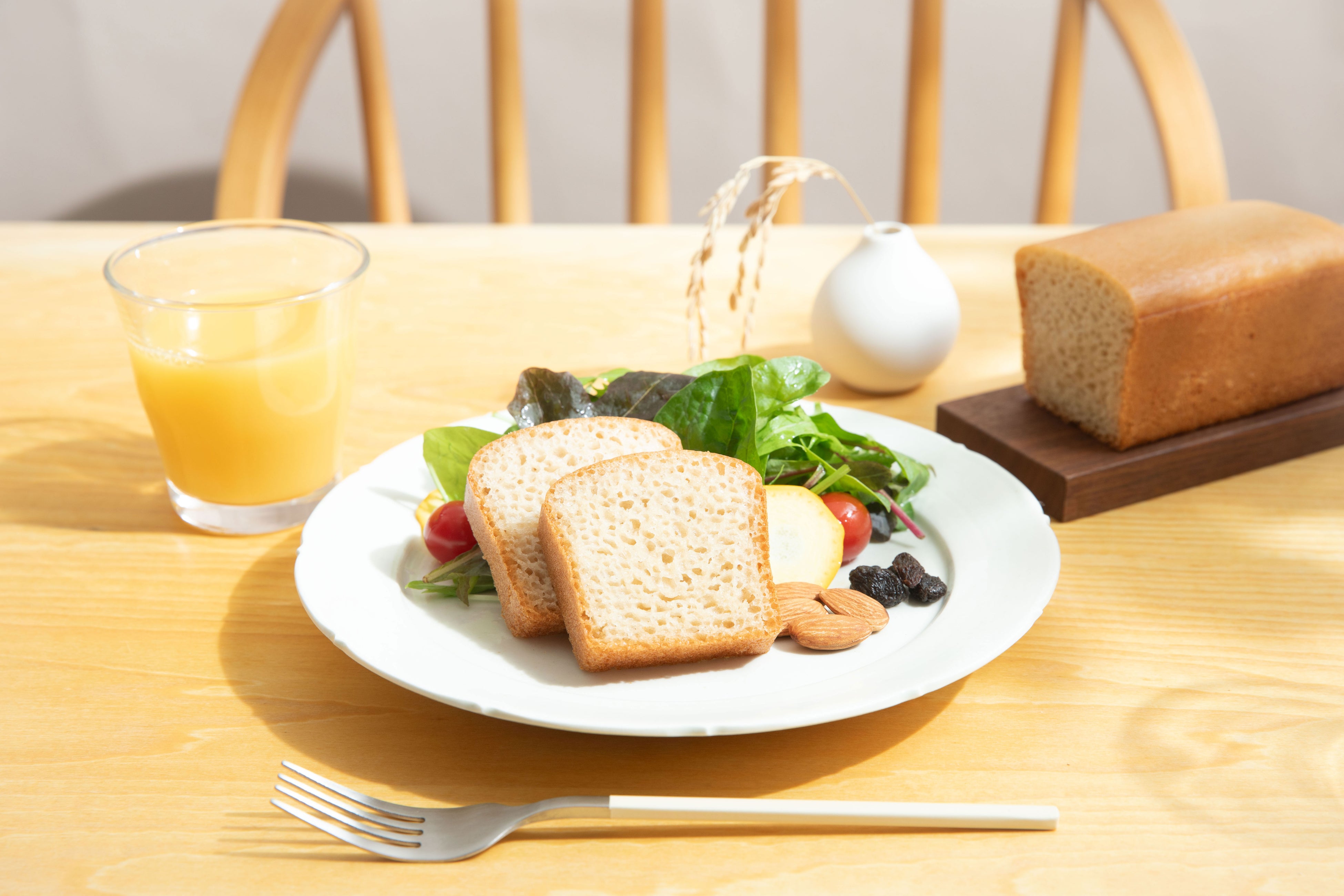 「有機山田錦の玄米パン」のおいしさの秘密は、じっくり水を含ませたお米をミキサーにかけてから天然酵母を加えて発酵させ焼き上げる「生米パン製法」。外はカリッ、中はふんわりきめ細かく、一般的な米粉パンの重い食感が苦手だった方にも喜ばれること間違いなし。噛めば噛むほど、ほんのり野生味のある風味が広がって、食事のおともやお酒のおつまみとしても食べ応えたっぷりです。これまで玄米独特のパサつく食感や、調理の手間にハードルを感じていた方も、このパンならおいしく手軽に玄米生活が始められます。