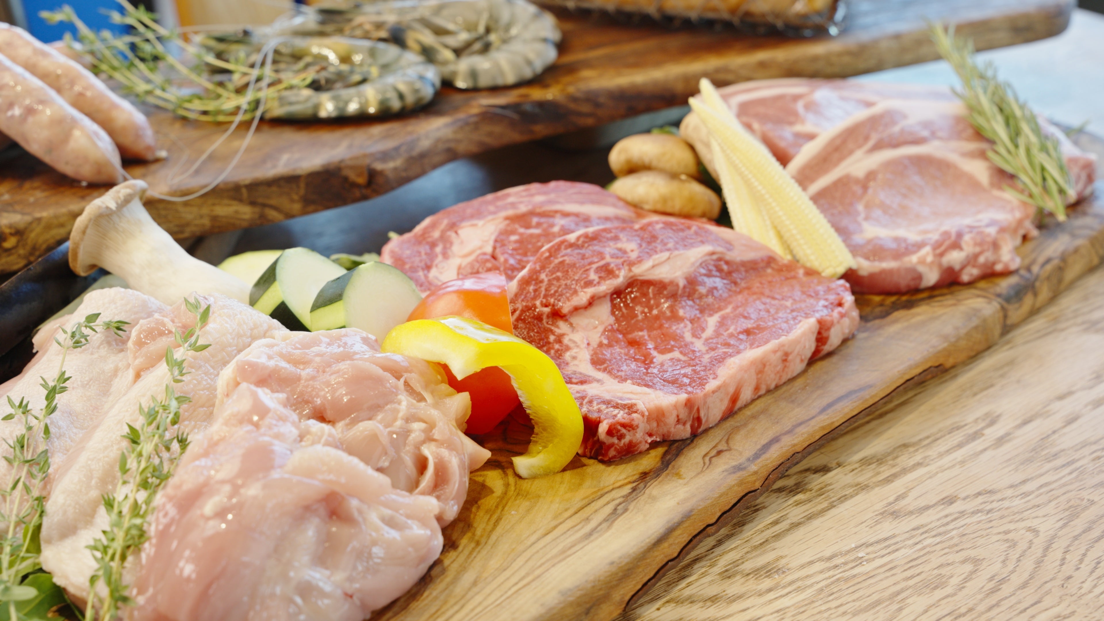 和牛ステーキ/白姫豚/風味鶏/ソーセージ/有頭エビ/ポテトフライ/野菜串/グリーンサラダ