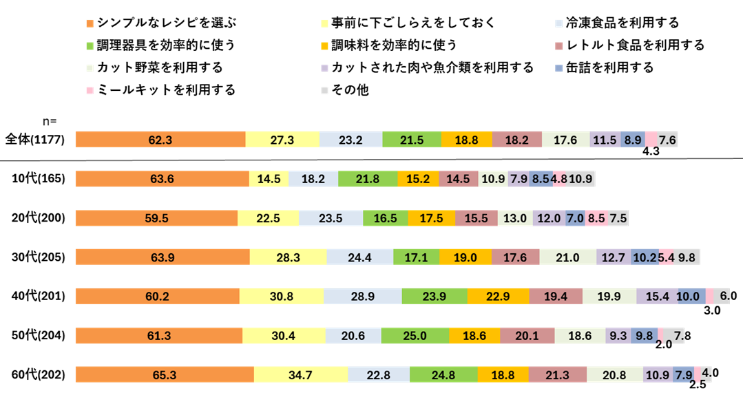 料理時間を短縮するための工夫を聴取したところ、「シンプルなレシピを選ぶ」が全体の約6割で最も高かった。次いで「事前に下ごしらえをしておく」「冷凍食品を利用する」「調理器具を効率的に使う」がそれぞれ2割台だった。冷凍食品や調理器具、調味料は、全ての年代で約2割が利用している。