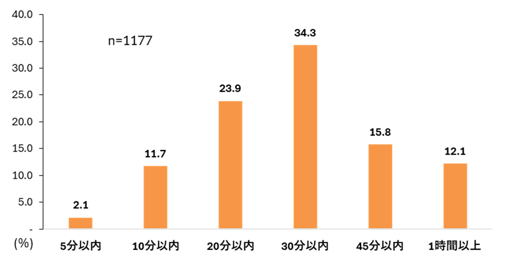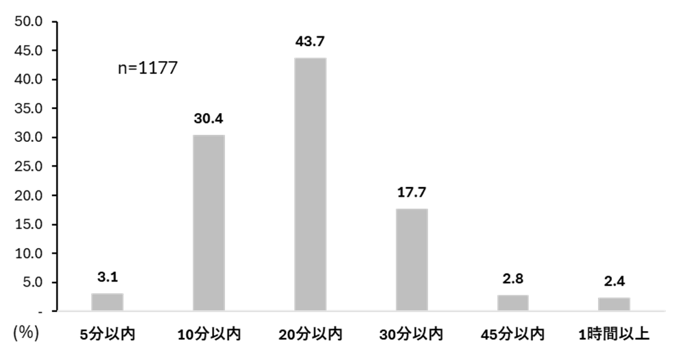 また、外食時の注文から料理提供までの時間について、どの程度待てるか聴取したところ、「20分以内」が43.7%で最も高い。次いで「10分以内」が30.4%だった。