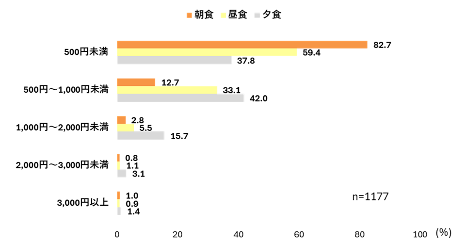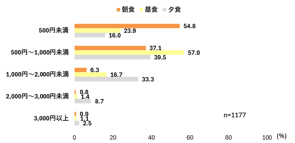 外食では、朝食は「500円未満」が約6割、昼食は「500円~1,000円未満」が約6割、夕食は「500円~1,000円未満」が約4割でそれぞれトップだった。夕食は2番目に「1,000円~2,000円未満」が高く、朝食・昼食に比べて、比較的お金をかける傾向が伺える。