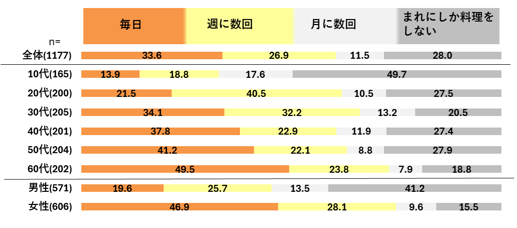 家庭で料理をする頻度は、「毎日」が全体の33.6%でトップだった。年代が上がるほど「毎日」料理をする割合が高い。女性のおよそ半数が「毎日」料理するのに対し、男性は約2割にとどまる。