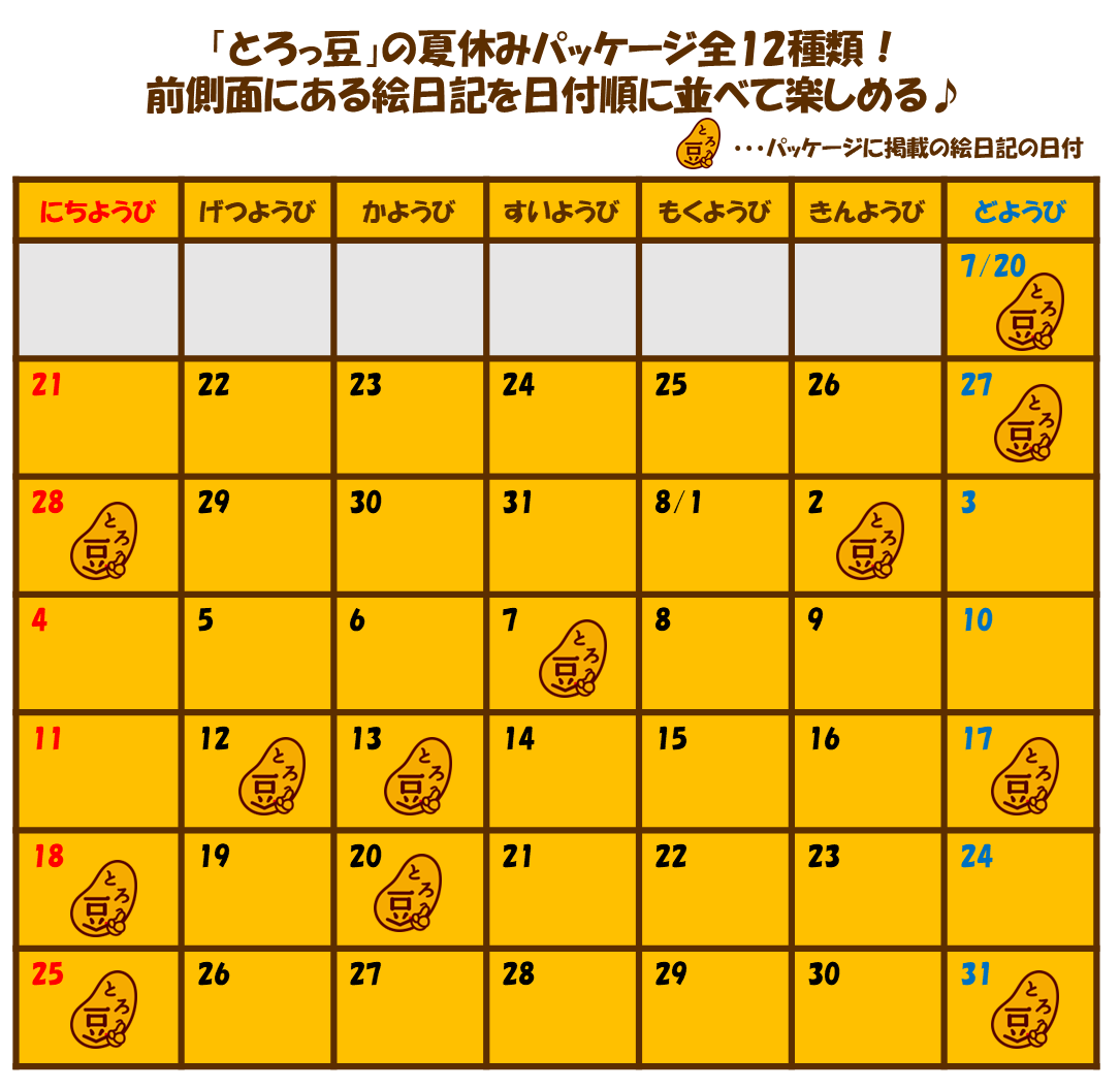 パッケージには、「とろっ豆」が夏休みを満喫する姿が描かれています。今回の見どころの1つは、パッケージの前側面に掲載されている「とろっ豆」の絵日記です。日付順に並べて読むと、「とろっ豆」の夏休み絵日記をより一層楽しむことができる仕掛けになっています。