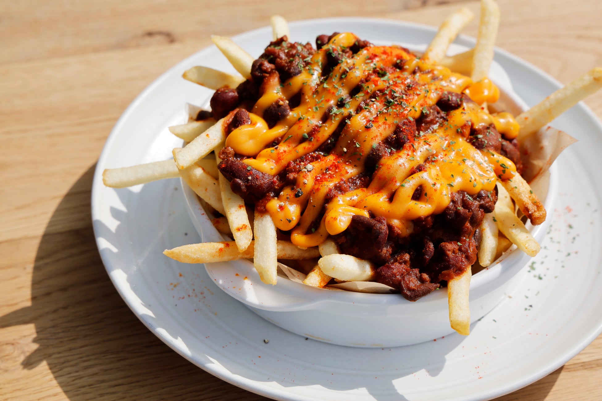 イベリコ豚のひき肉とレッドキドニー、ブラックビーンズを数種類のスパイスとトマトソースでじっくりと煮込んだチリコンカン。細切りのポテトにたっぷりかけ、最後にチェダーチーズを合わせたスパイシーな味わいの中にコクを感じる、ビールにもピッタリな一品。