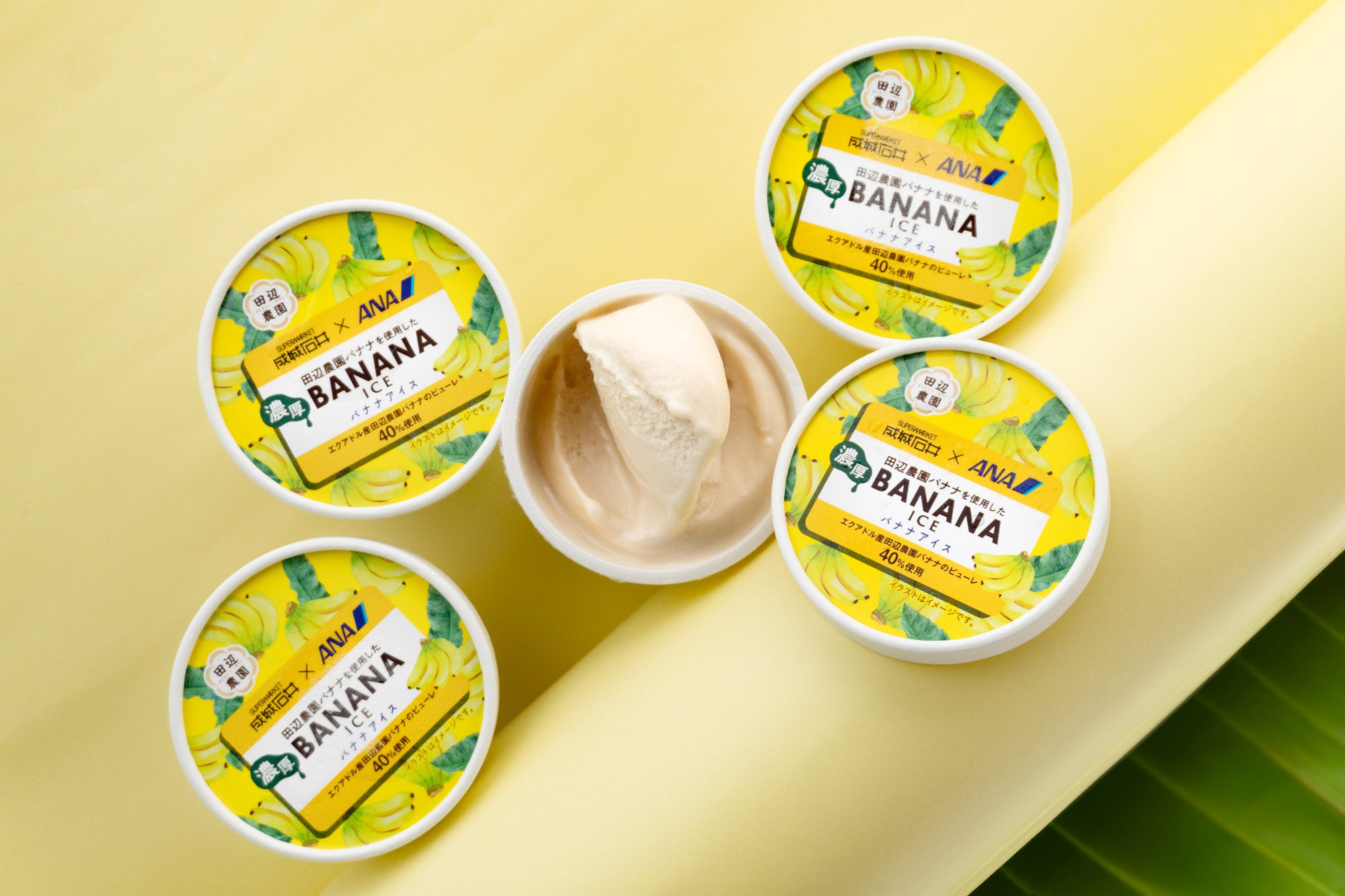ANAフーズのオリジナルブランド「田辺農園」のバナナを使用し、濃厚な甘みとバナナ本来の風味を最大限に味わえるアイスに仕上げました。バナナピューレの配合を変えるなど何度も試作を繰り返し、最適な配合比率を追求。製品中に40%使用しています。また、フードロスの観点からバナナは規格外品を使用しています。滑らかな舌触りで、1個まるまるお召し上がりいただいても飽きがこない味わいになっています。