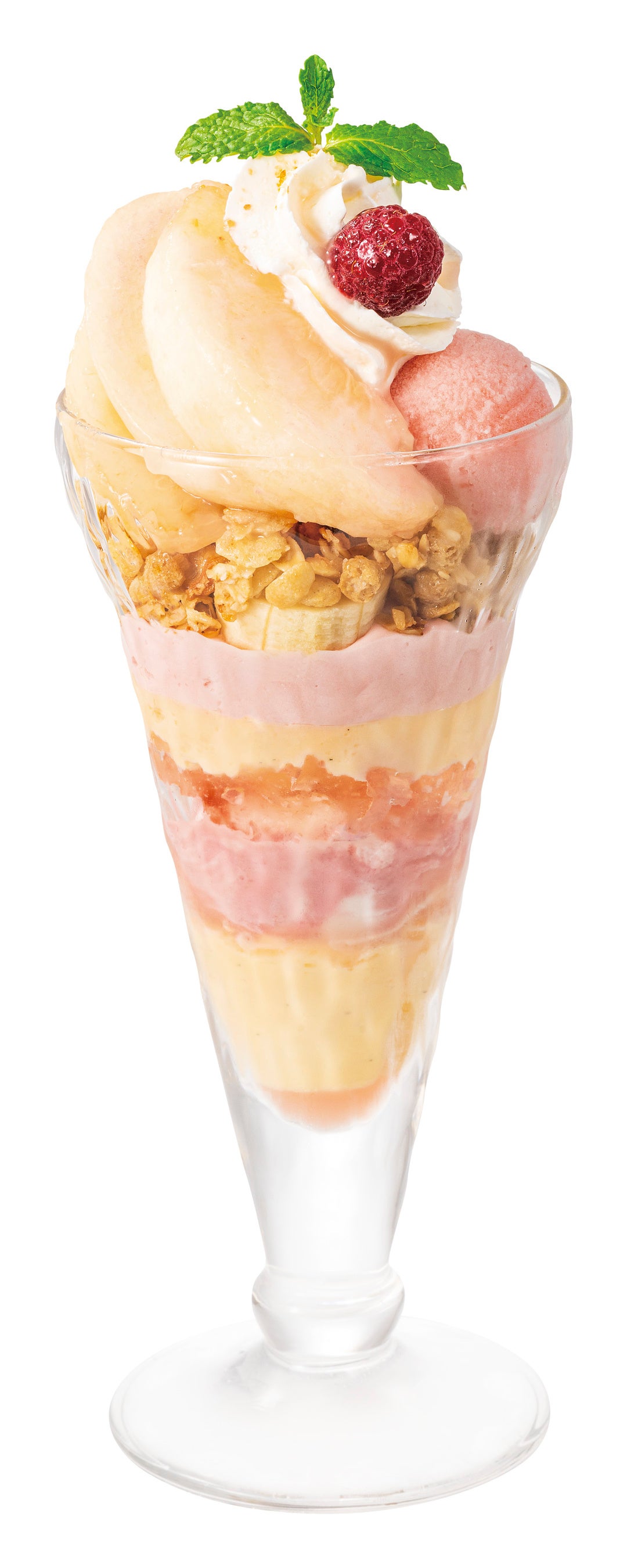 満足なサンデーです!みずみずしい桃の果実と、すっきりとしたプラムソルベ、酸味とコクがマッチしたラズベリークリームチーズアイス、滑らかな口当たりのバナナ、爽やかなレモンチーズクリームなど、バラエティ豊かな素材が味わいを引き立てます。