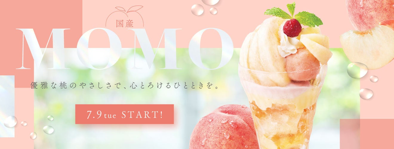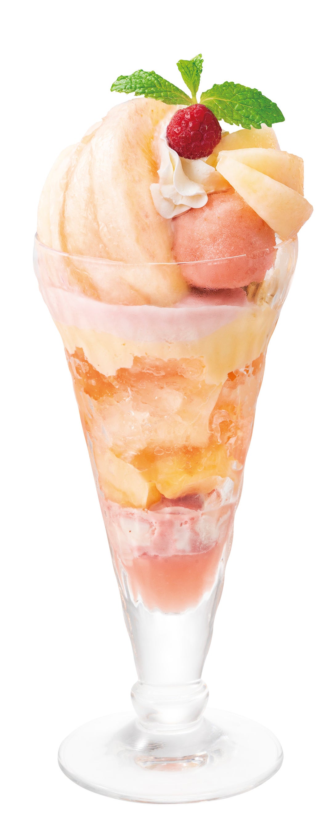 今年は、桃をまるまる1個使用したご褒美サイズの「サンデー」を筆頭に、ティータイムに最適な「パルフェ」や注文ごとにお店で仕立てる「ショートケーキ」、桃をドリンク仕立てにした「フレッシュ」に、暑い今の時期にピッタリな「かき氷」など、昨年から品数を拡充し計8品を揃えました。