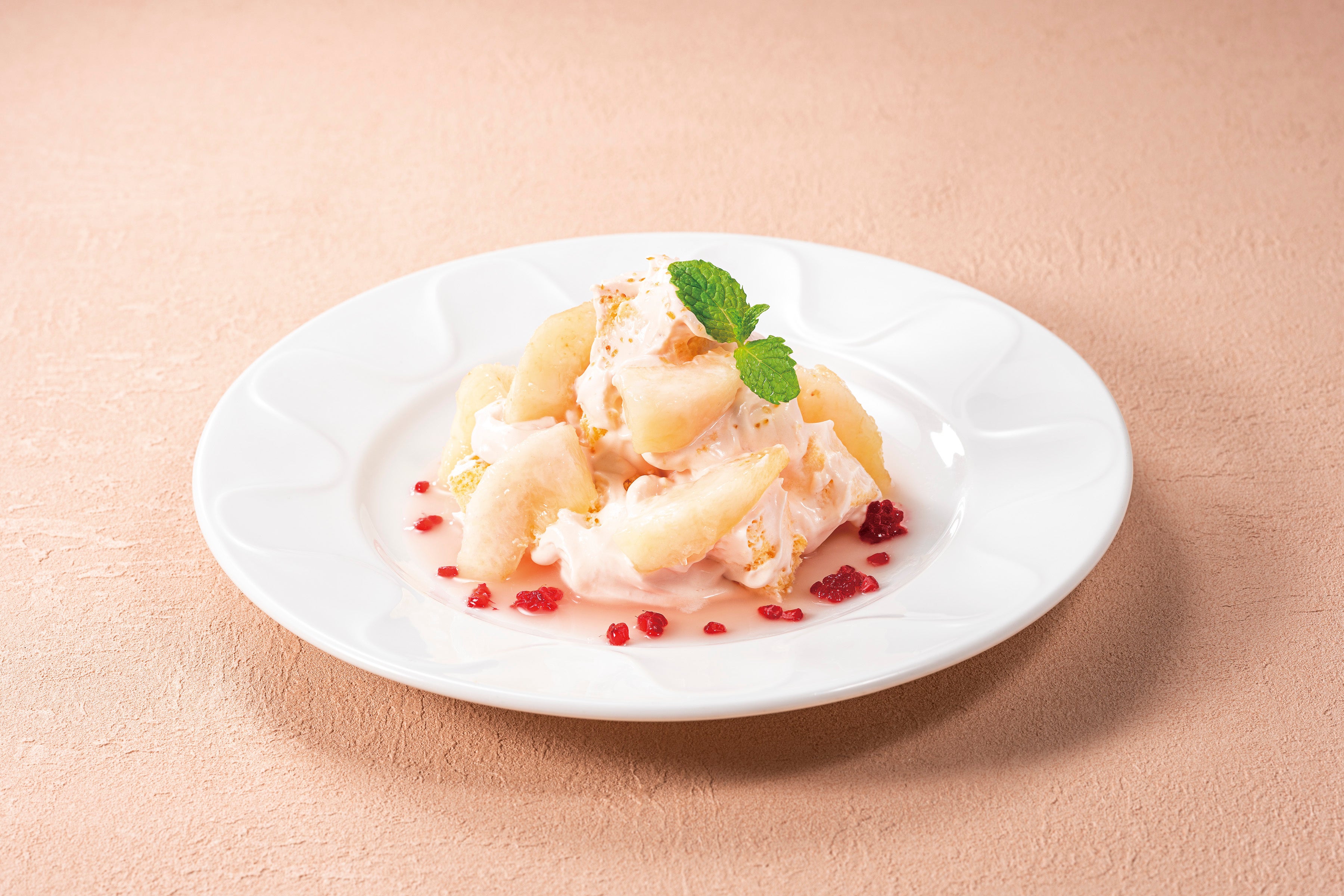 なめらかな桃の果実と、プラムソルベ、ラズベリークリームチーズアイス、桃クリーム、カスタードレモンチーズクリームと、甘さと酸味のバランスが相性抜群!ほどよいボリューム感なので、食後のデザートにもおすすめです。