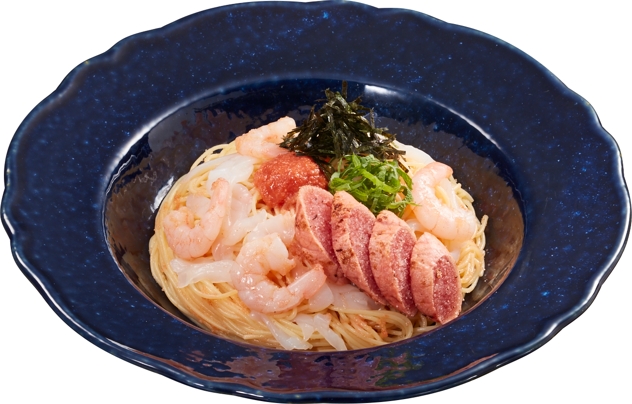 明太子ソースの冷製カッペリーニに、炙り明太子、明太子、むきエビ、細切りのヤリイカをのせた一品です。人気の明太子パスタを、990円(税込1,089円)のお手頃価格でご堪能いただけます。