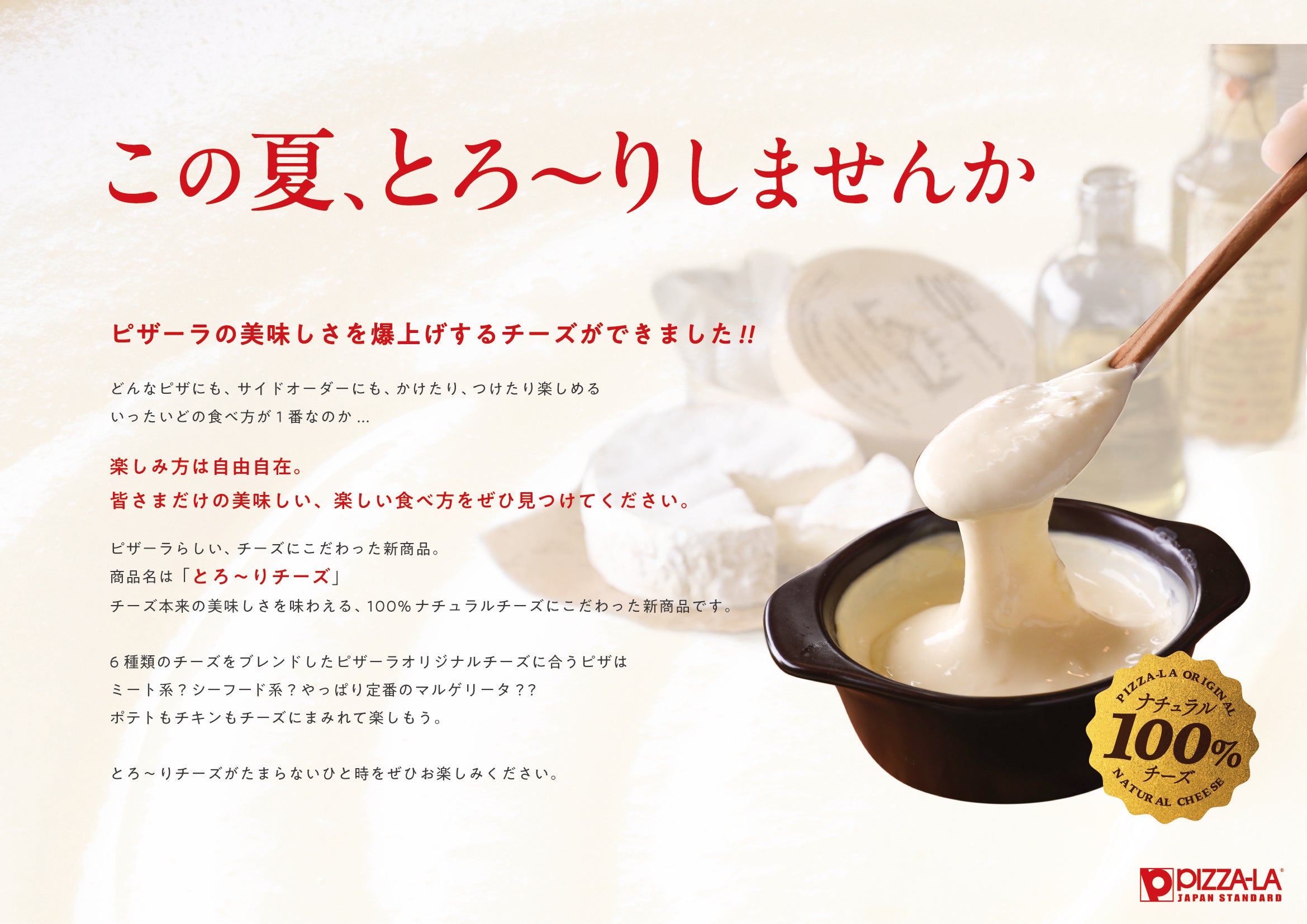 チーズ本来のコクと旨みがたっぷり。厳選したナチュラルチーズをオーブンでとろけるように焼き上げたました。とろとろ『とろ~りチーズ』は、ピザにかけたり、ピザやサイドメニューなどにつけたり、楽しみ方は自由。とにかくおもいっきりチーズが楽しめる新商品です。