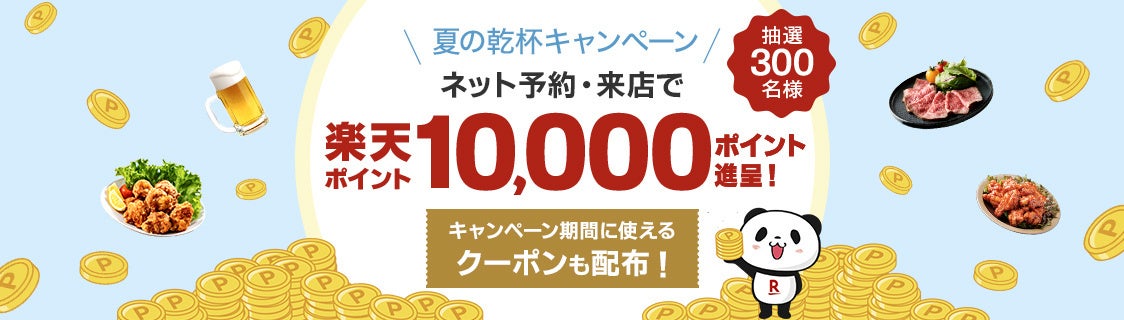 本キャンペーンでは、対象の飲食店でランチ1,500円以上、ディナー3,000円以上のコースを2名以上でネット予約・来店した方から抽選で300名様に「楽天ポイント」10,000ポイントを進呈します。さらに、「ぐるなびネット予約クーポン」合計20,000枚以上を同時期に発行します。最大6,000円オフのクーポンも用意しており、「楽天ポイント」やクーポンを獲得しながらお得に夏の宴会を楽しむことができます。