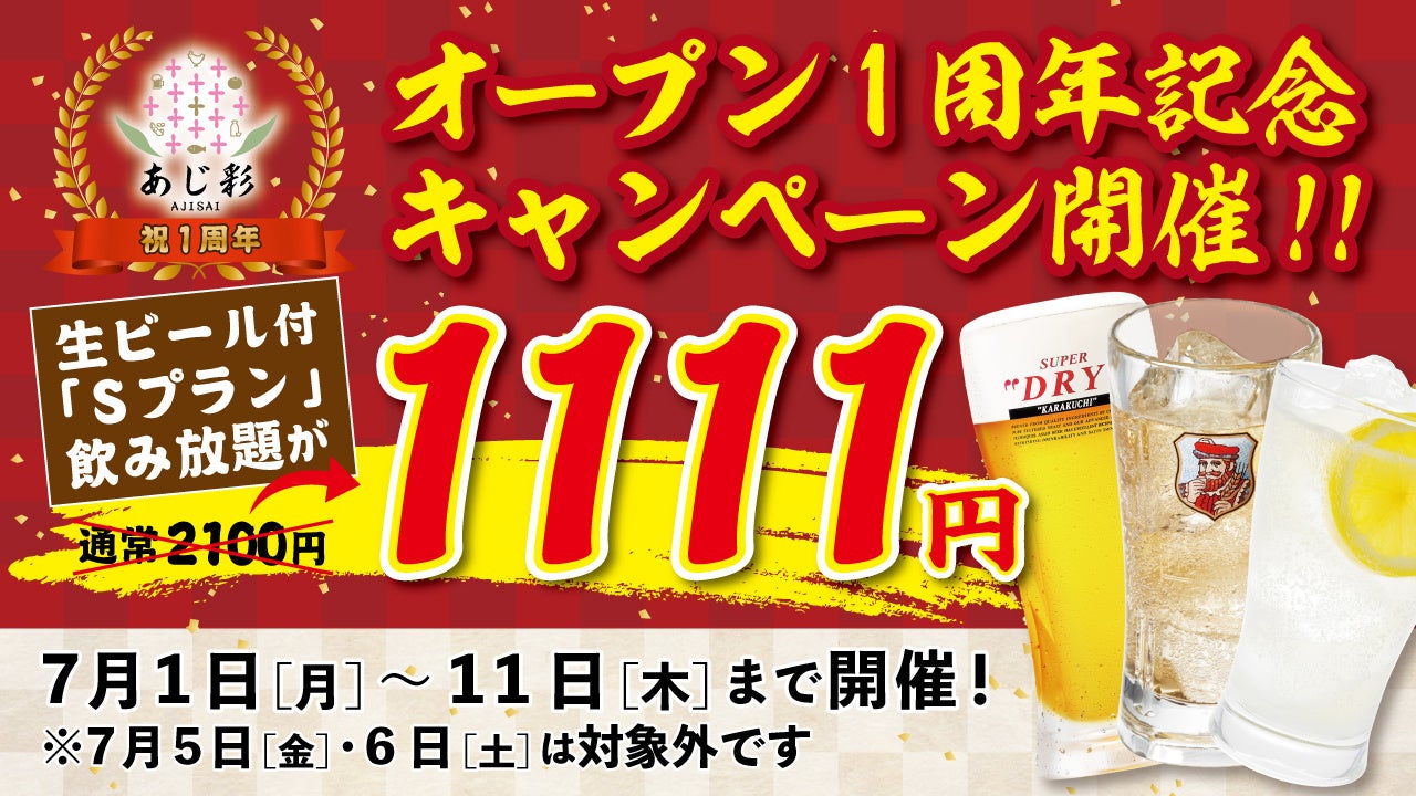 開店よりたくさんのご来店をいただいた1年分の感謝を込めて、通常価格2100円で提供している「生ビール付きSプラン飲み放題」を1111円(税込)にて提供いたします。