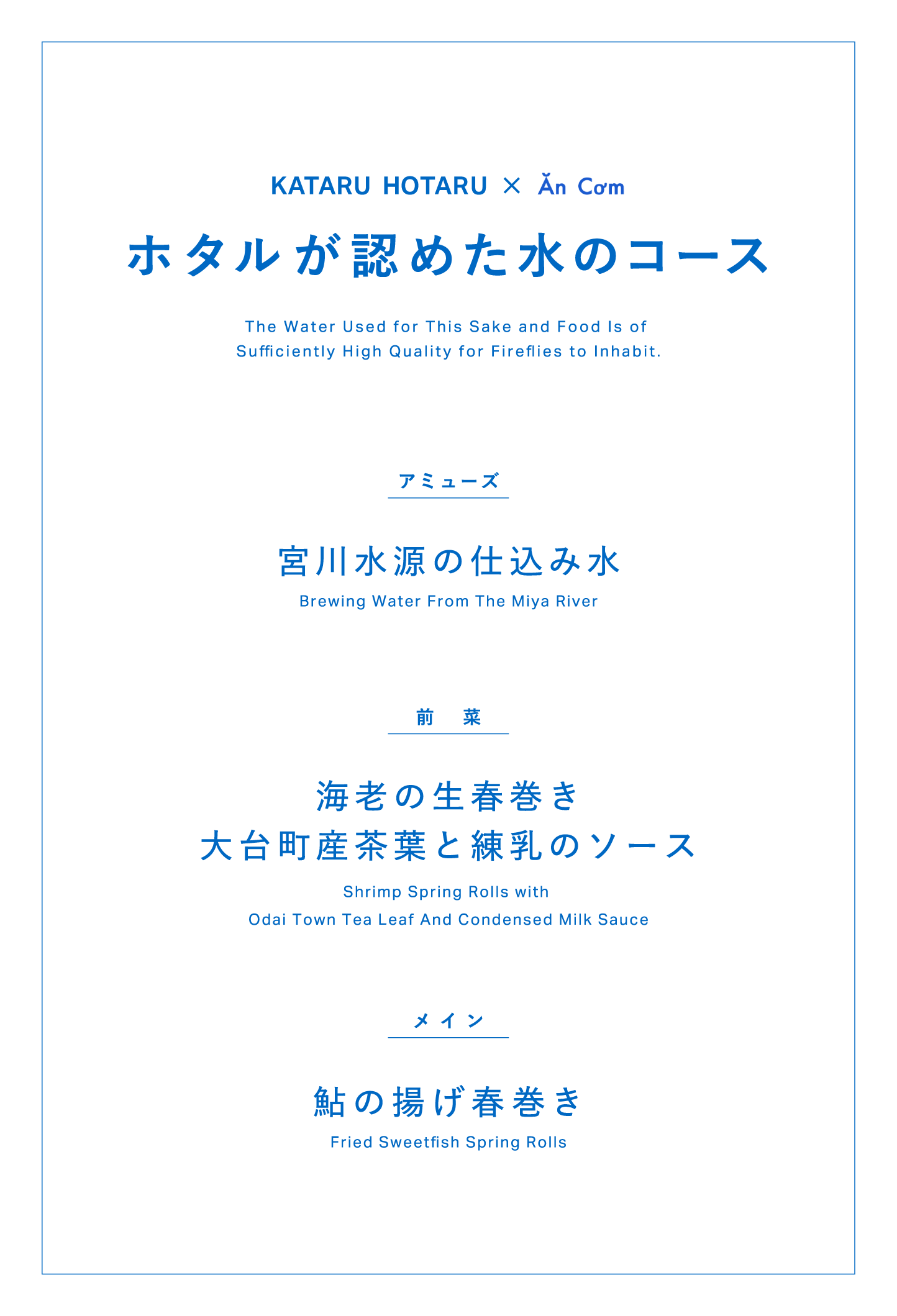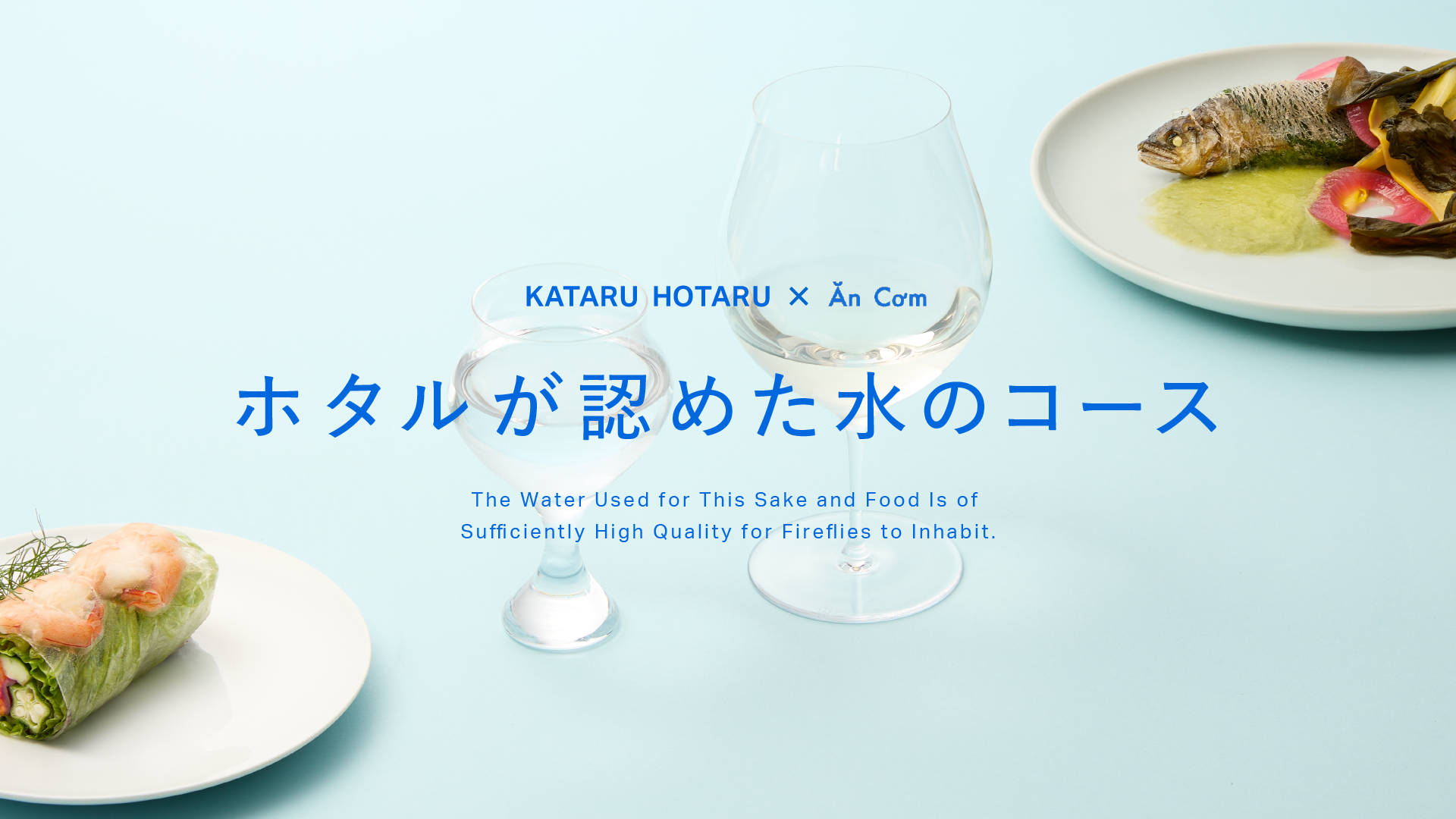 「語蛍」販売開始に伴い、広尾のベトナムビストロ“Ăn Cơm”にてプロダクトの特徴であり酒づくりにもホタルの生息にも重要な“水”を主役にした限定のペアリングコース「ホタルが認めた水のコース」を7月1日(月)より期間限定で提供を開始します。
