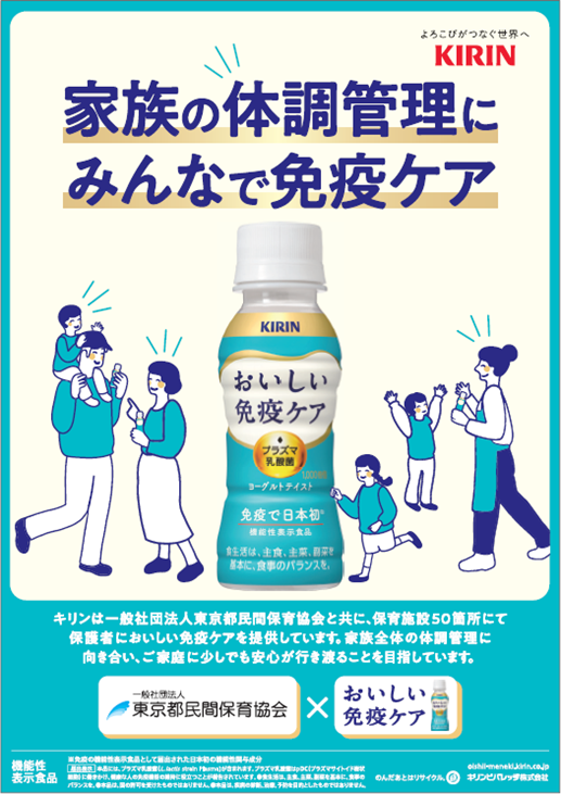 □ 時期 :2024年7月8日(月)〜 □ 配布箇所:保育協会と連携している保育施設50カ所(順不同) ・鈴の音保育園・うれしい森保育園・ゆりのこ保育園・かなまち虹保育園・みどりの森保育園・ナーサリースクールいずみ大谷田・松原保育園・聖華しおかぜ保育園・わかたけ保育園・白梅保育園・東福保育園・立華学苑・志村さかした保育園・さくら保育園・梅郷保育園・仲町にこにこ保育園・清瀬上宮保育園・練馬二葉保育園・のぞみこども園・つつじ保育園・あいわ保育園・無二保育園・かすみ台第一保育園・ひなた保育園・大禮保育園・おともだちララ保育園・ゆうき山保育園・王子隣保館保育園・聖保育園・不動の森こども園・あっぷる池上保育園・世田谷いちい保育園北ウイング・三星保育園・東上野乳児保育園・のはら保育園・しいのみ保育園・柴又学園・荒川区立汐入とちのき保育園・最勝寺みのり保育園・熊川保育園・畑中保育園・あおば保育園西が丘・たかね第二保育園・ナースリー保育園・かさい発みらい行きほいくえん・舟渡保育園・横川保育園・蓮美幼児学園とよすナーサリー・同援はいじま保育園・桑都保育園 □ 実施内容:「キリン おいしい免疫ケア」(合計30,000本配布予定) 「ポスター」(合計200枚配布予定) 「アンケート」(合計4,618家族に実施予定) |
