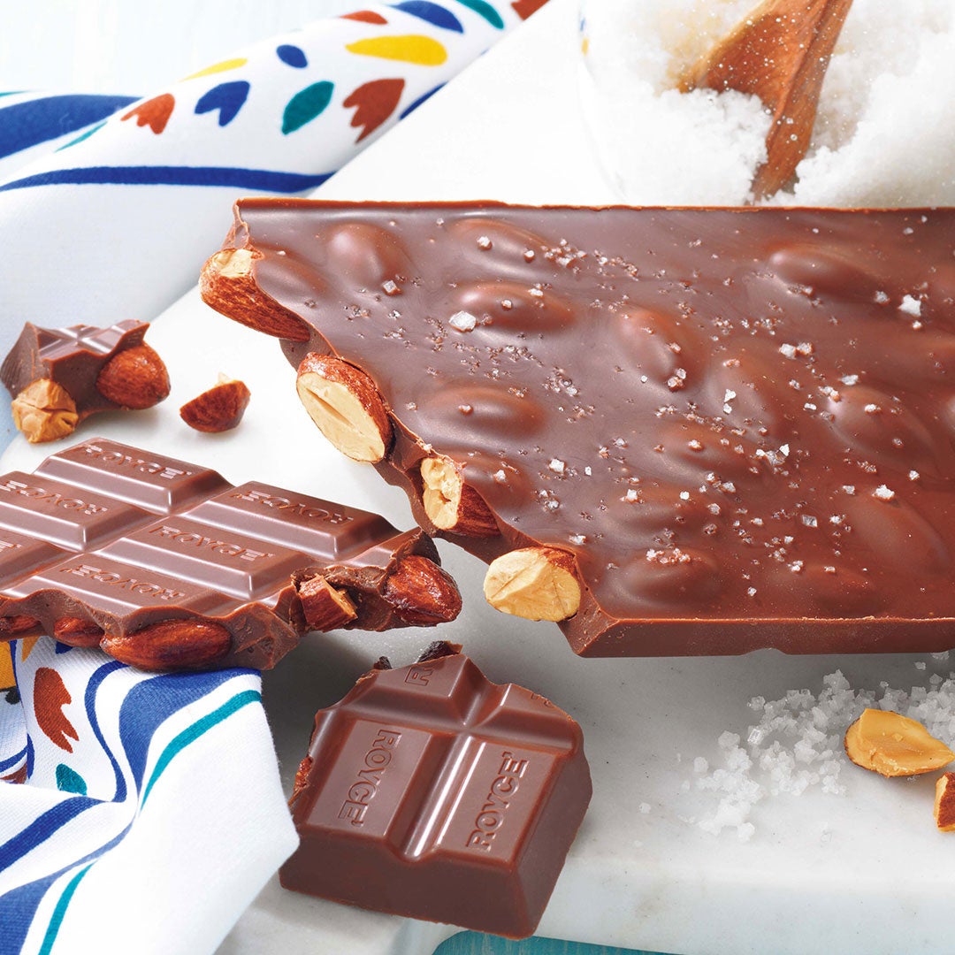 ミルクチョコレートにキャンディング(飴がけ)したアーモンドをたっぷり入れてつくった板チョコレートに、旨み豊かな「ゲランドの塩」を散りばめました。まろやかながら存在感のある塩の味わいが、チョコレートとナッツの風味をぐっと豊かに引き出します。
