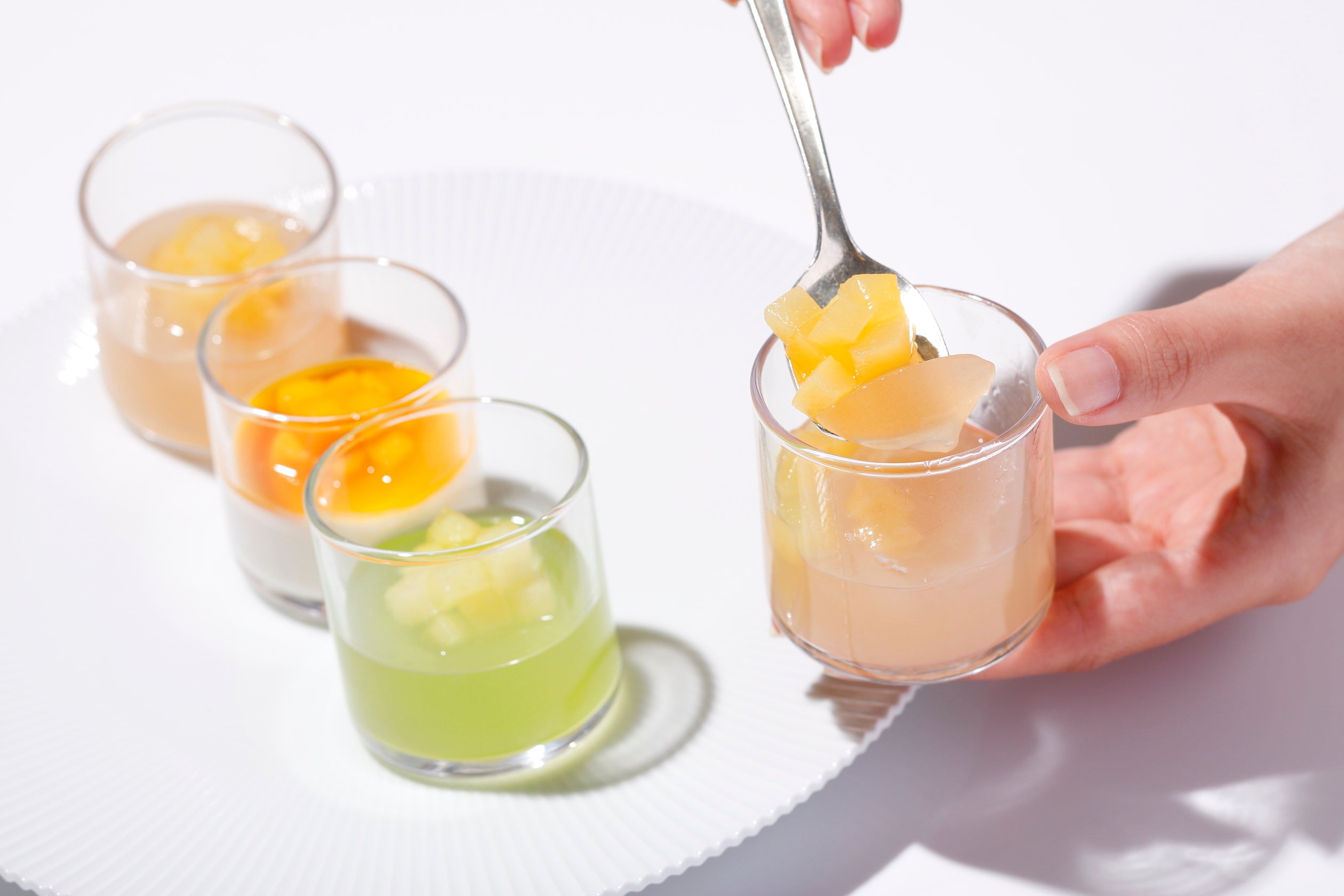 爽やかな酸味と甘さが広がり、果肉がトッピングされてる『マスクメロンゼリー』と岩手県産の岩泉ヨーグルトに甘酸っぱいパッションフルーツとマンゴーのジュレをトッピングした『岩泉ヨーグルトゼリー』に加え、みずみずしい桃の甘みが凝縮され、果肉をトッピングした『ピーチゼリー』が登場。さっぱりと口どけが良く、桃の美味しさを感じられるぷるんと柔らかい食感と桃の甘さが口いっぱいに広がるスイーツです。