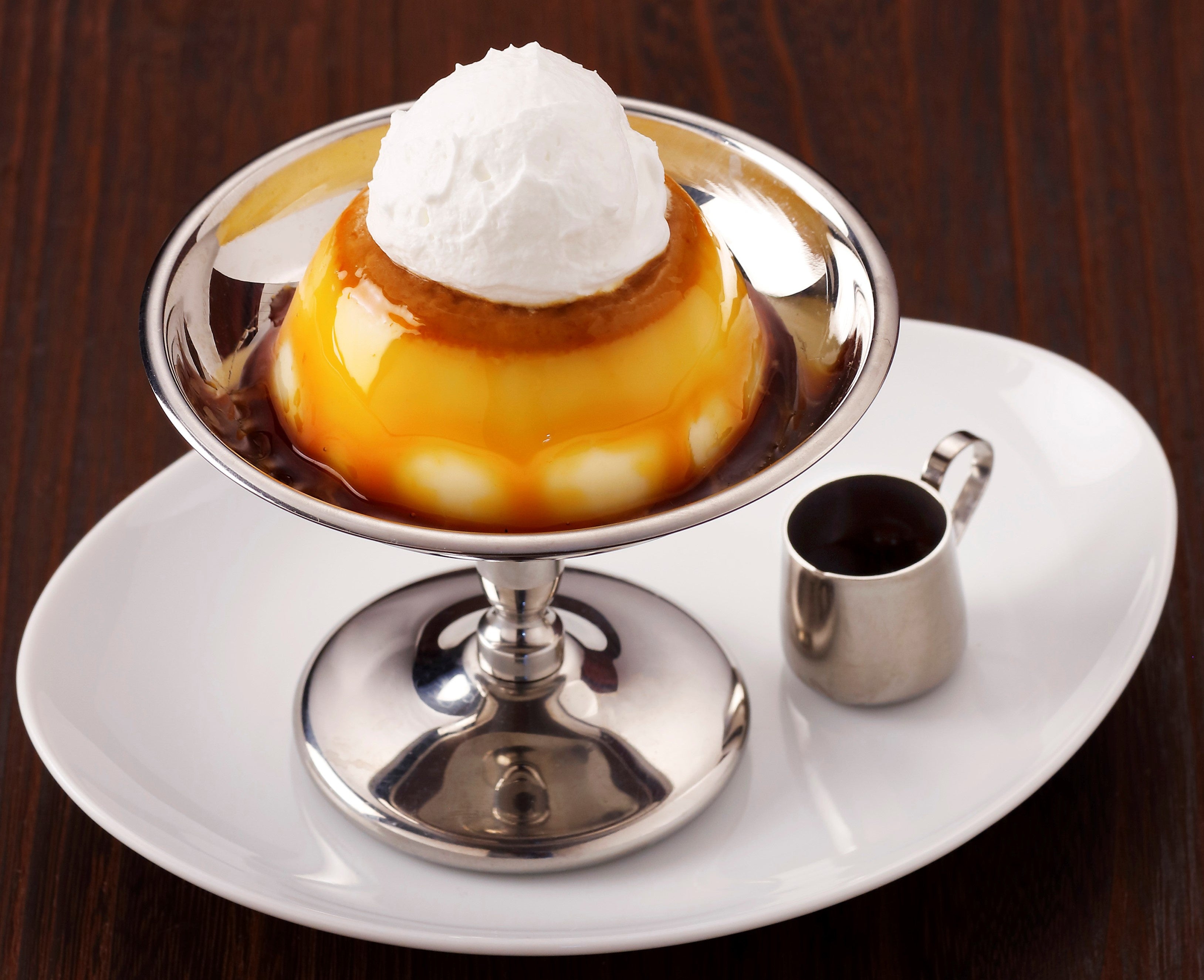 懐かしい味わいのクラシカルなプリンにホイップクリームをのせて。ほろ苦いカラメルソースがアクセント。