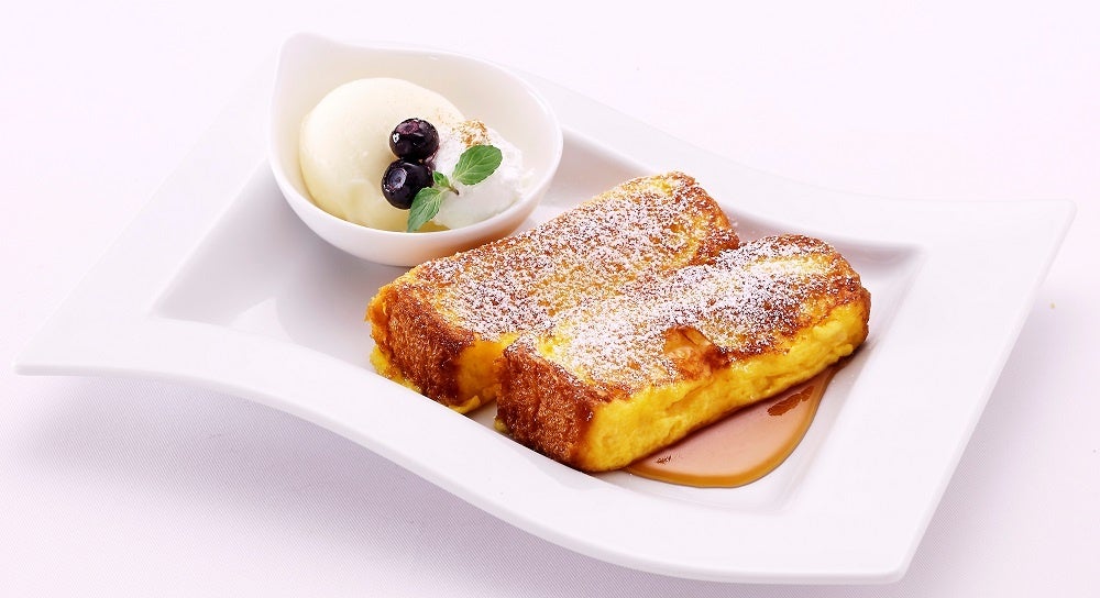ふわふわのブリオッシュをたっぷりの卵とミルクに漬け込み、こんがりと焼き上げた贅沢なフレンチトースト。バニラアイスを添えて。