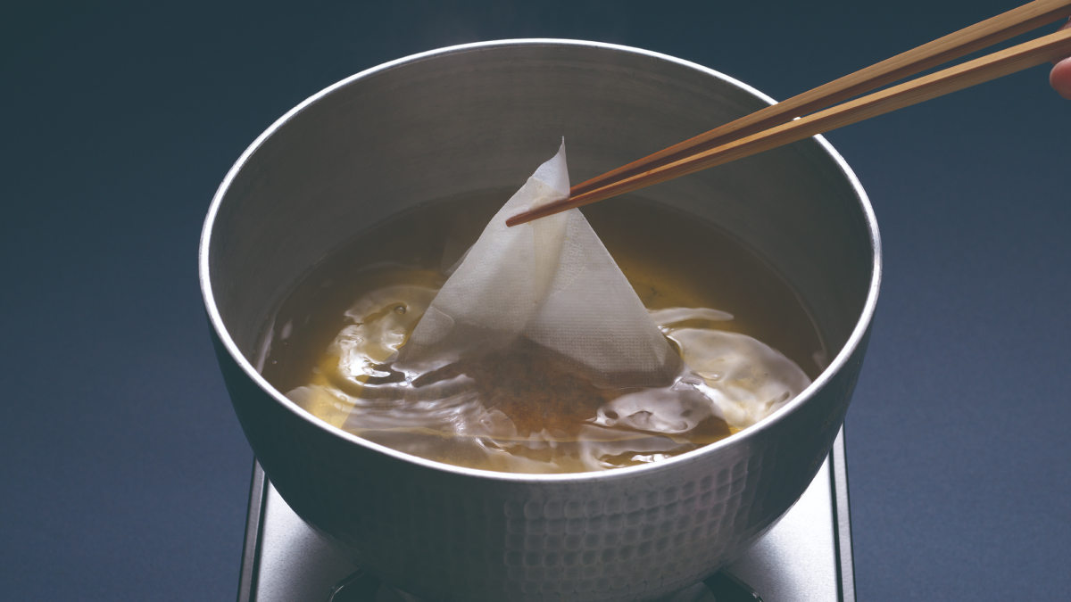 茅乃舎では初めてとなるテトラ型(正四面体)のだしパックを採用しています。一辺約11cm、1パックあたり17gというボリュームある形態にもご注目ください。