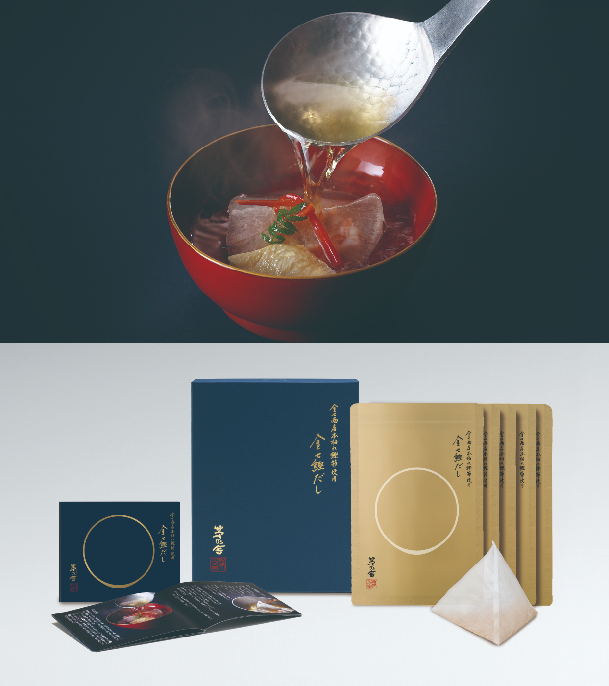 今回の「金七鰹だし」は、上質な本枯れ節に、北海道産天然利尻昆布とあご煮干しを合わせることで深いうまみに仕上げています。厳選した三種の素材を粉砕し、ブレンドしています。だし素材のみのうまみで、塩分や調味料は一切加えていません。まずはお吸物で、だしのおいしさをお確かめください。その他、おひたしやだし巻き玉子、すき煮などもおすすめです。