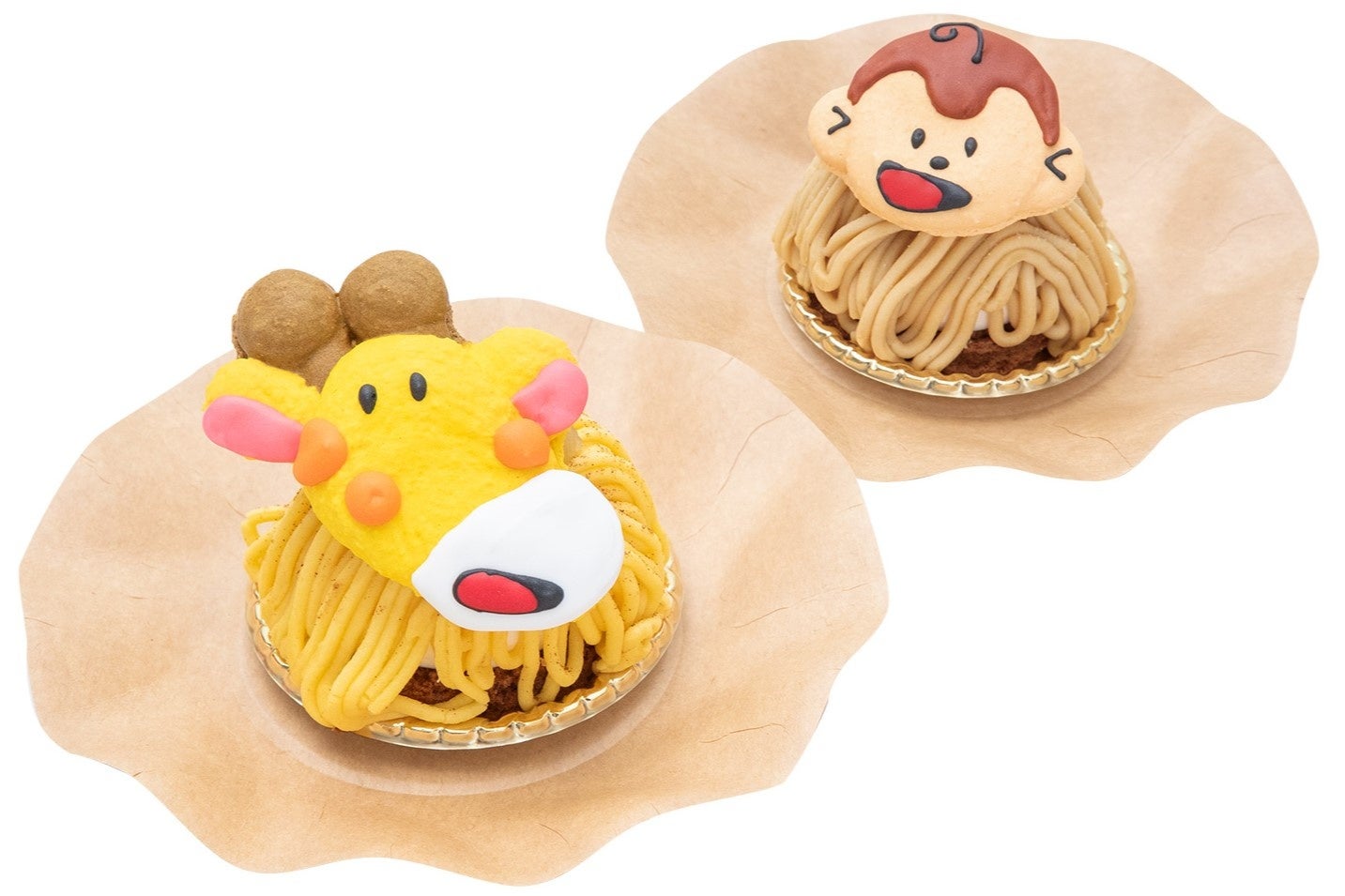 きりんさんとさるさんのかわいらしい笑顔のマカロンに、それぞれのどうぶつさんをイメージした異なるモンブランを組み合わせた本格派スイーツです。